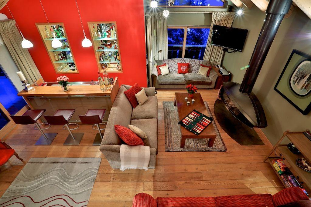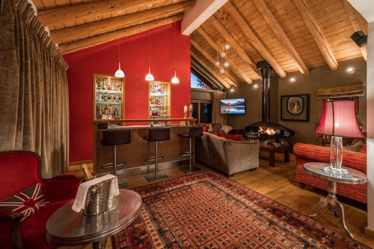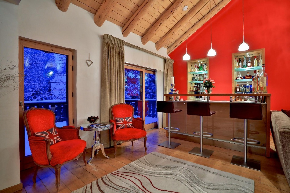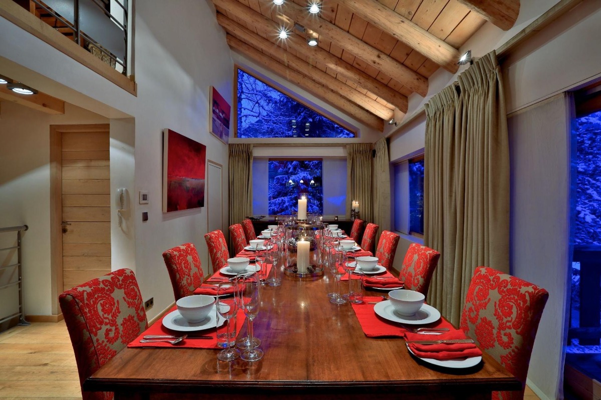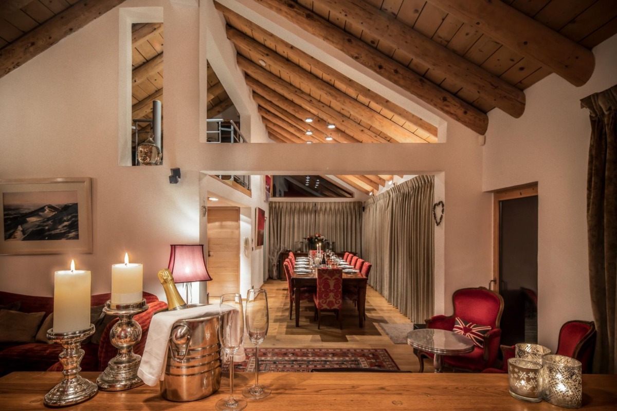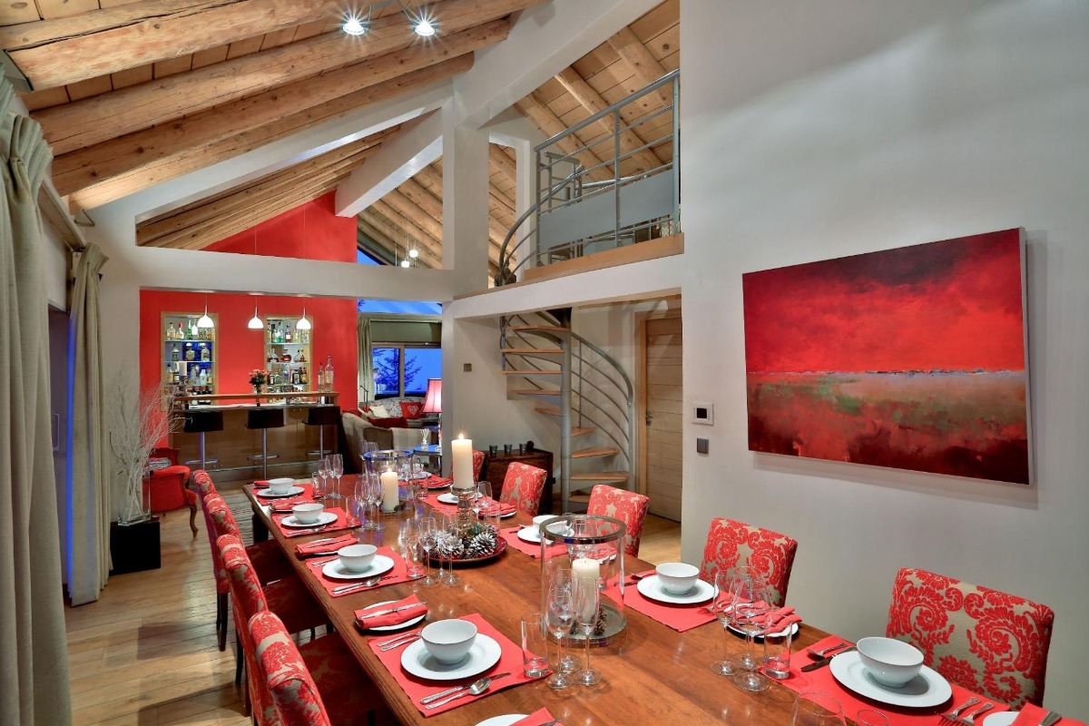 Просторная столовая открытой планировки, гостиная и бар сливаются воедино, образуя теплое и уютное жилое пространство. Сочетая традиционные альпийские черты с некоторыми роскошными современными штрихами, зона отдыха шале предлагает приятное место для проведения вечеров. Высокие сводчатые потолки, подвесной камин и стильный бар только добавляют очарования этому впечатляющему пространству. Обеденная зона состоит из огромного элегантного обеденного стола, идеально подходящего для изысканного ужина для гурманов. Винтовая лестница ведет наверх в антресольный кабинет, из которого открывается вид на основное жилое пространство, а на нижнем этаже вы можете найти большой телевизор для уютного вечернего просмотра. Высокие окна от пола до потолка в главной гостиной обеспечивают много естественного света и выходят на просторный балкон, выходящий на южную сторону, где можно понежиться в лучах полуденного солнца после катания на лыжах.