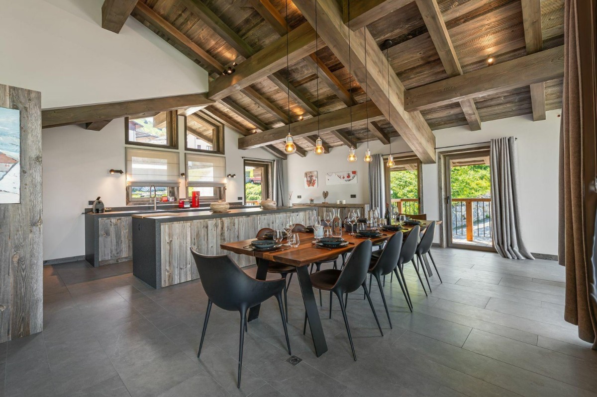 Шале имеет современную архитектуру, ассоциирующуюся с традиционным горным стилем с сильным присутствием дерева. Присутствуют цветовые штрихи, усиливающие тон и создающие реальный контраст. Большие эркеры гостиной и спален позволяют солнцу проникать внутрь и придают прекрасное сияние всему помещению.