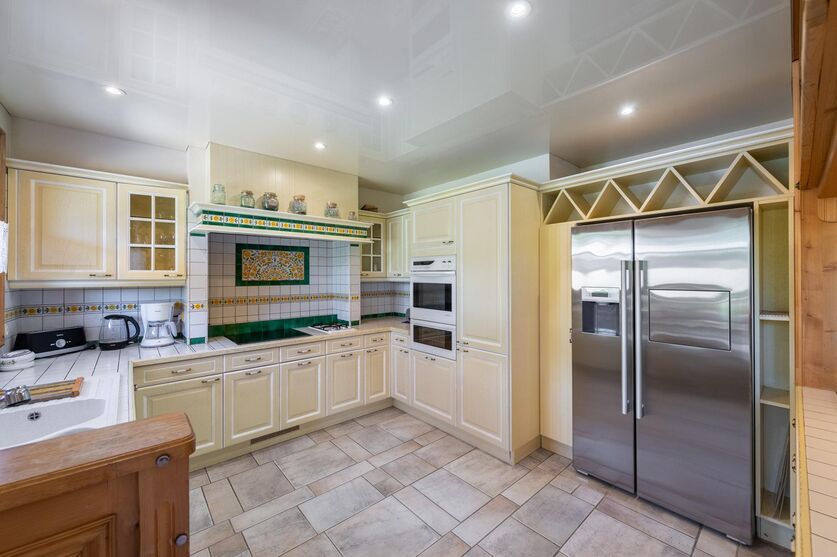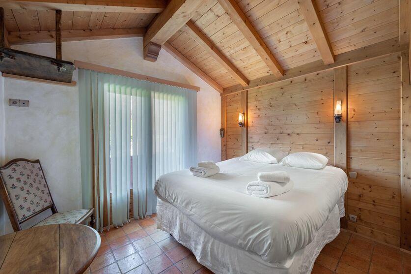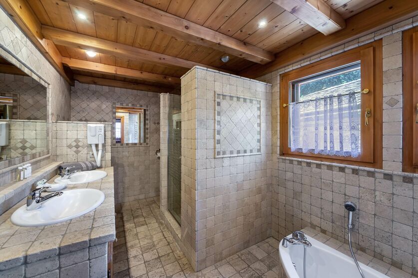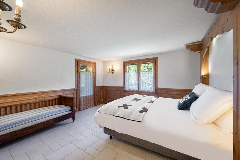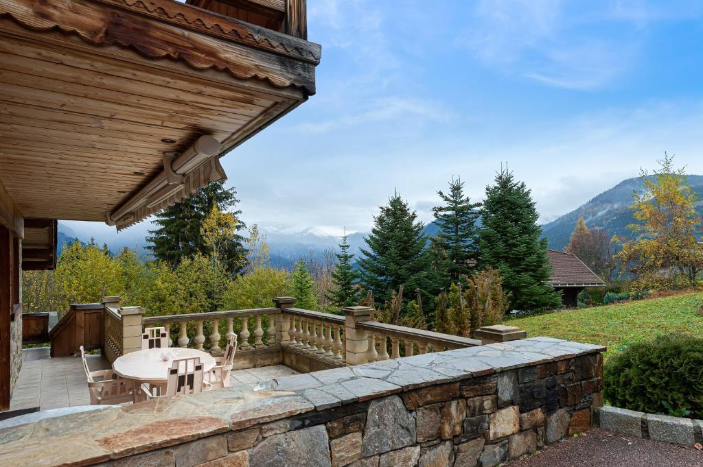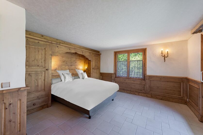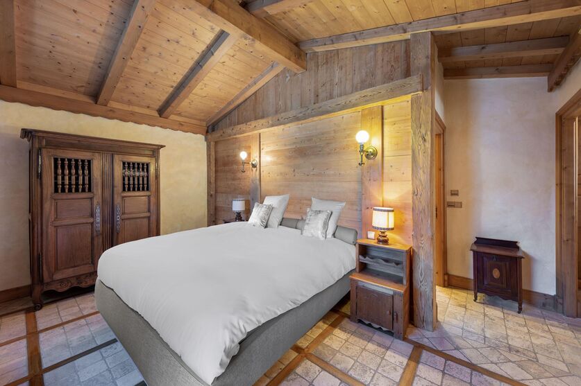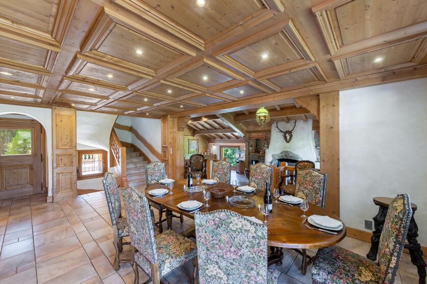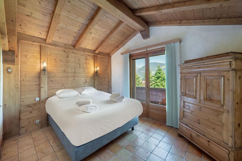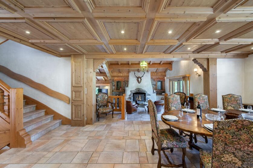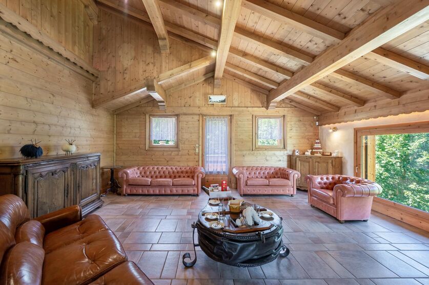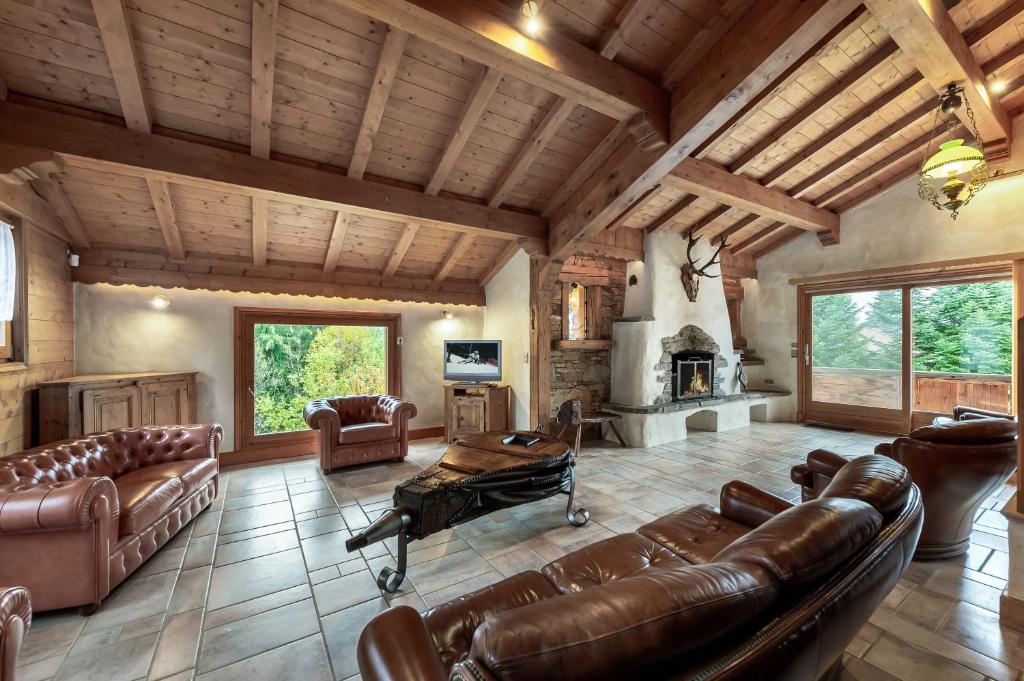 Шале имеет типичную савойскую архитектуру с преобладанием дерева в гостиной и спальнях. Гостиная светлая и просторная, с естественной цветовой палитрой.