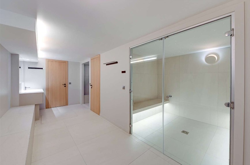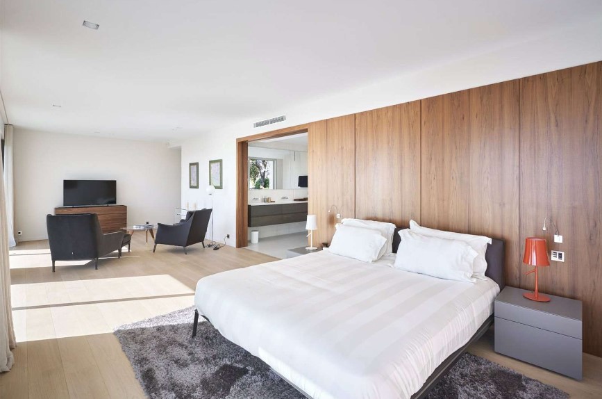 Главный вход находится на втором этаже, ведет в приемную, оборудованную кухню и винный погреб. Еще одна приемная расположена на первом этаже вместе со спальней и кабинетом. На первом этаже расположены четыре спальни с ванными комнатами, хаммам и домик у бассейна.
