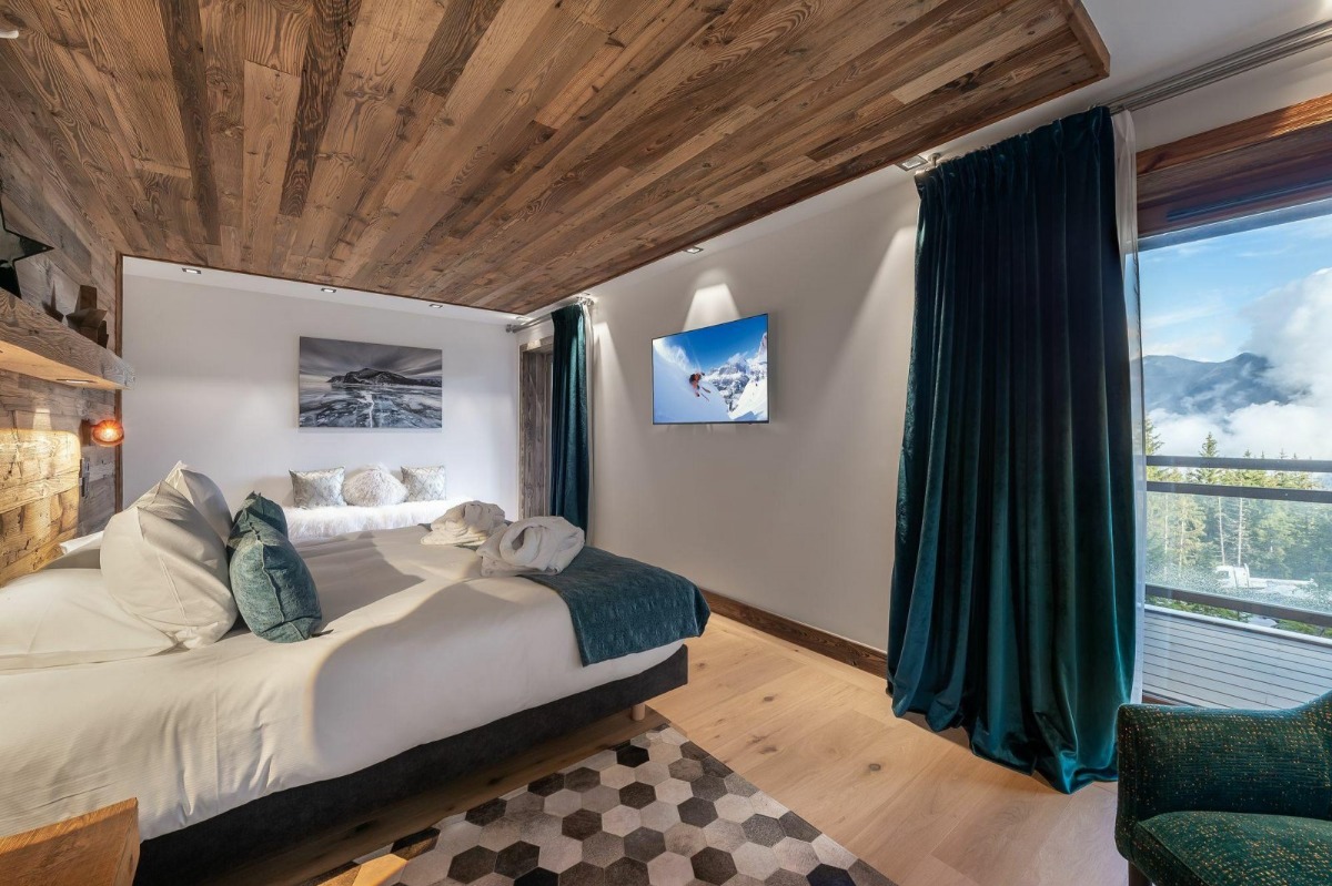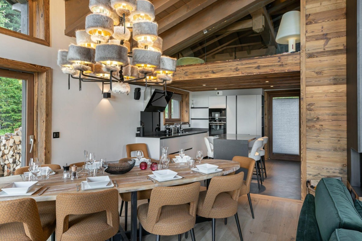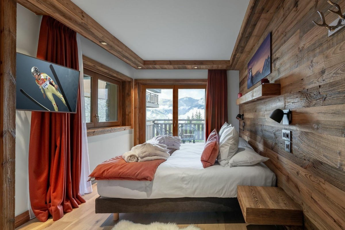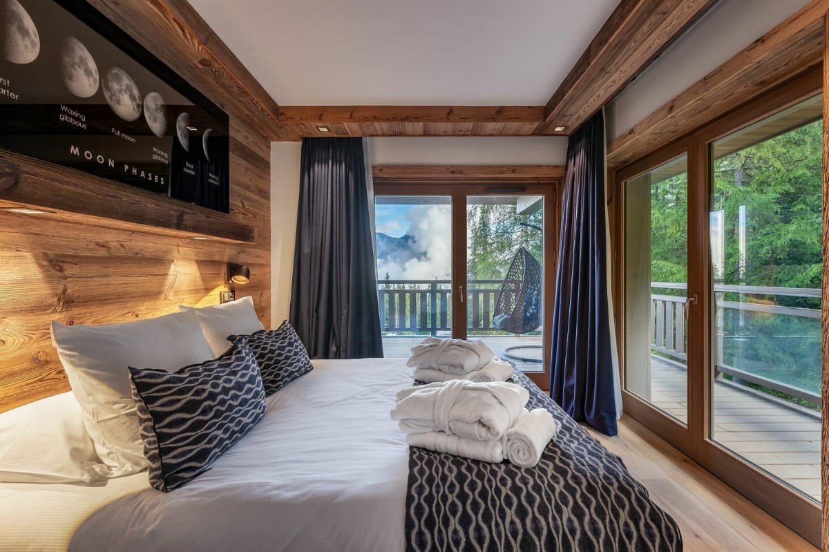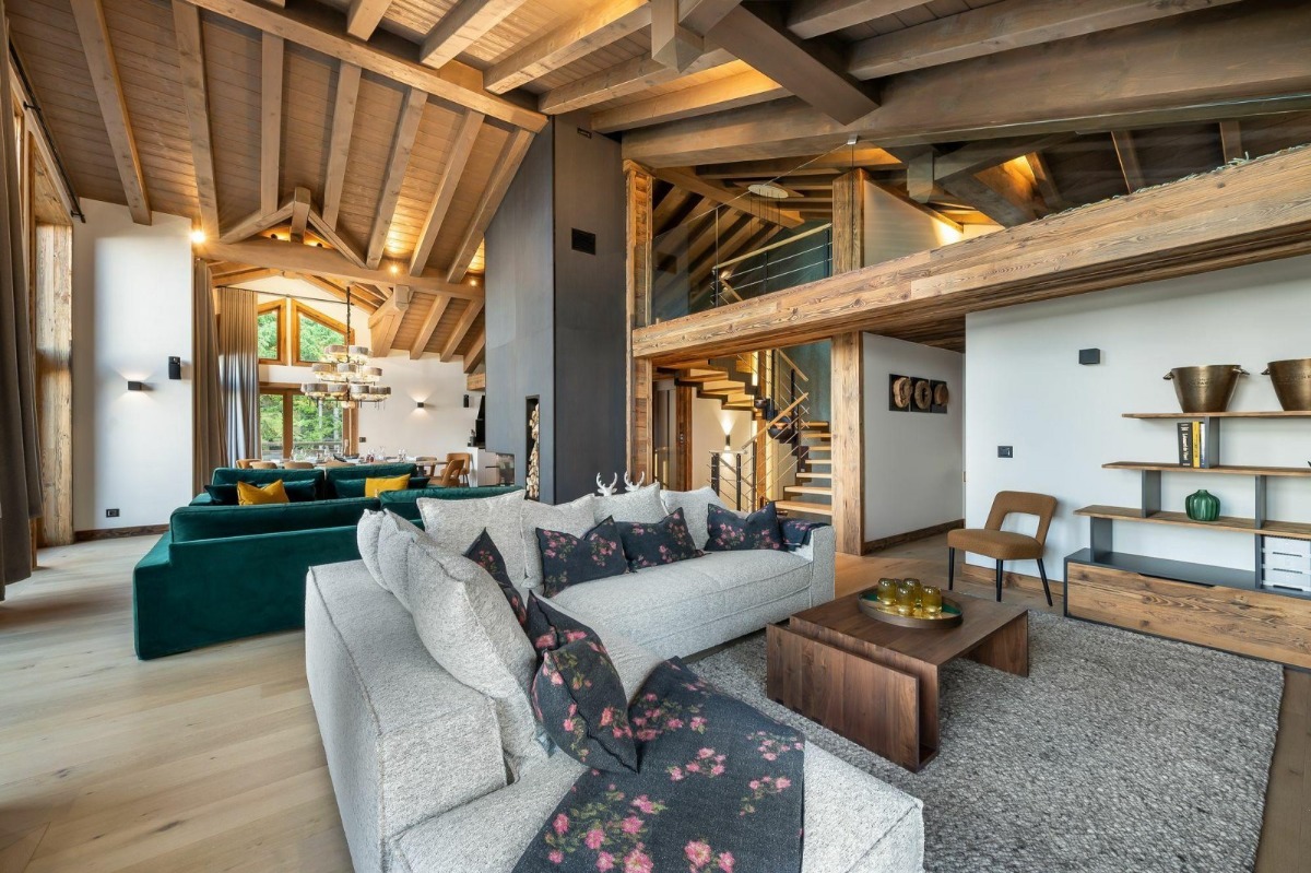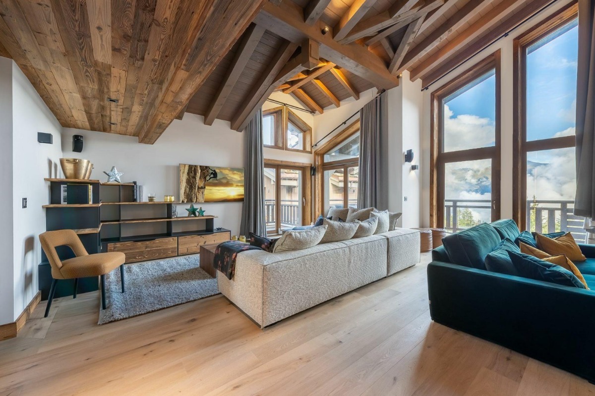Шале отличается элегантным и теплым интерьером, отображающим коды настоящего альпийского стиля. Деревянные панели натуральных цветов, диваны XXL и шерстяные портьеры создают атмосферу. Жилое пространство распределено по четырем уровням, обслуживаемым лифтом. Это большое семейное шале предлагает шесть спален с ванными комнатами. Гостиная с соборным потолком, обогреваемая камином, большими окнами выходит на снежный пейзаж. Она соединена с террасой, где вы можете насладиться джакузи на открытом воздухе.