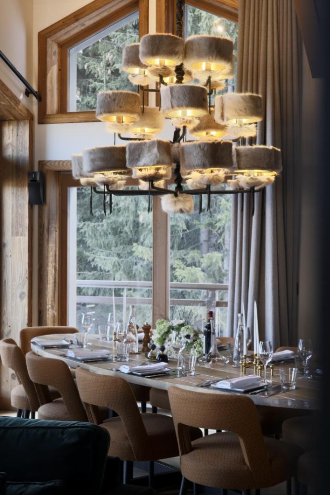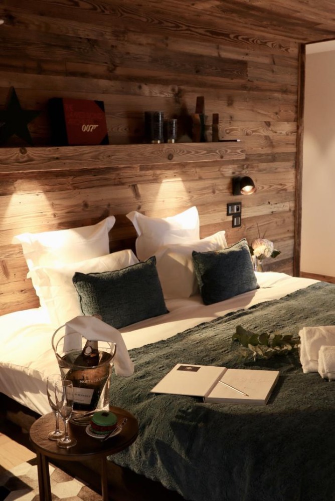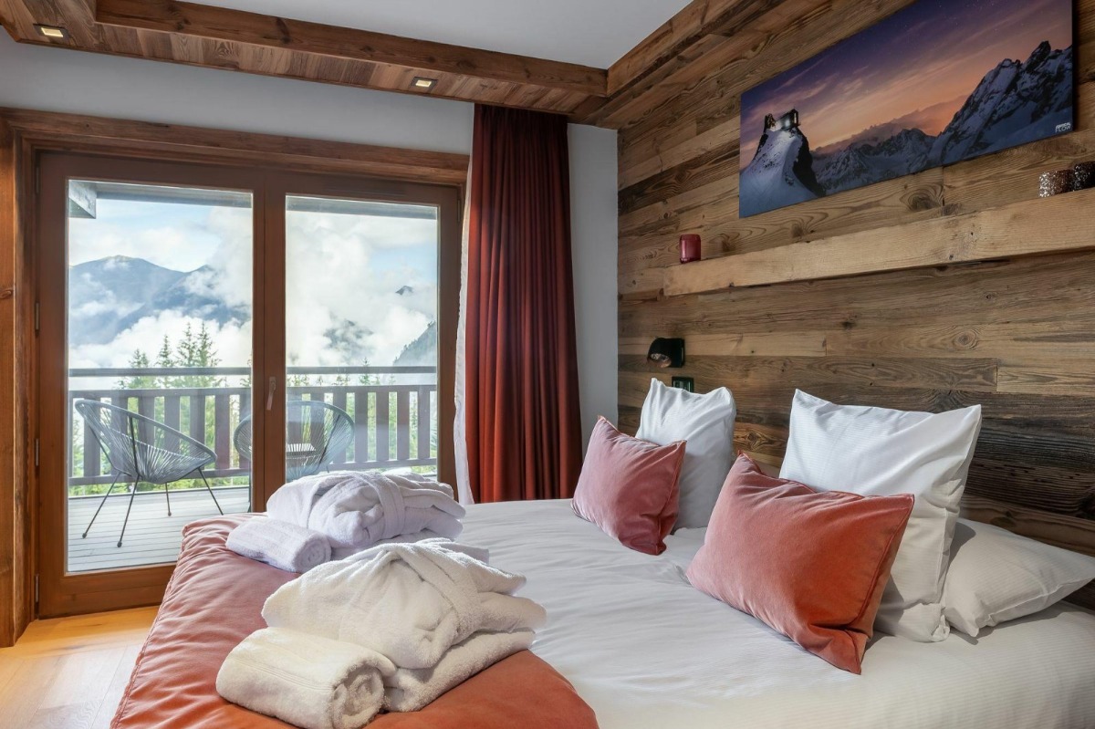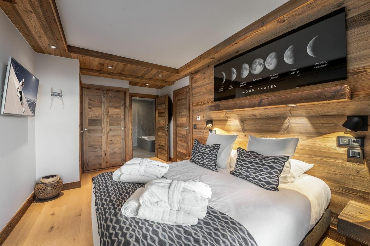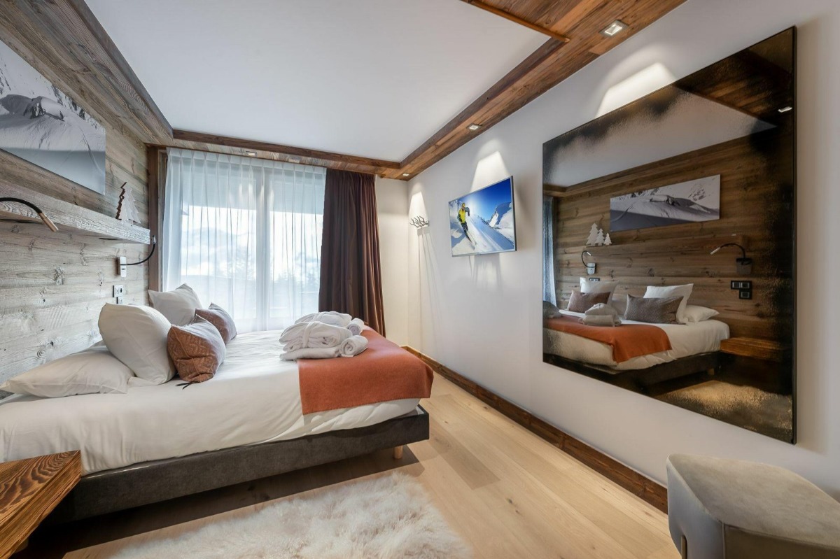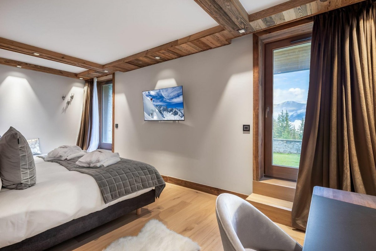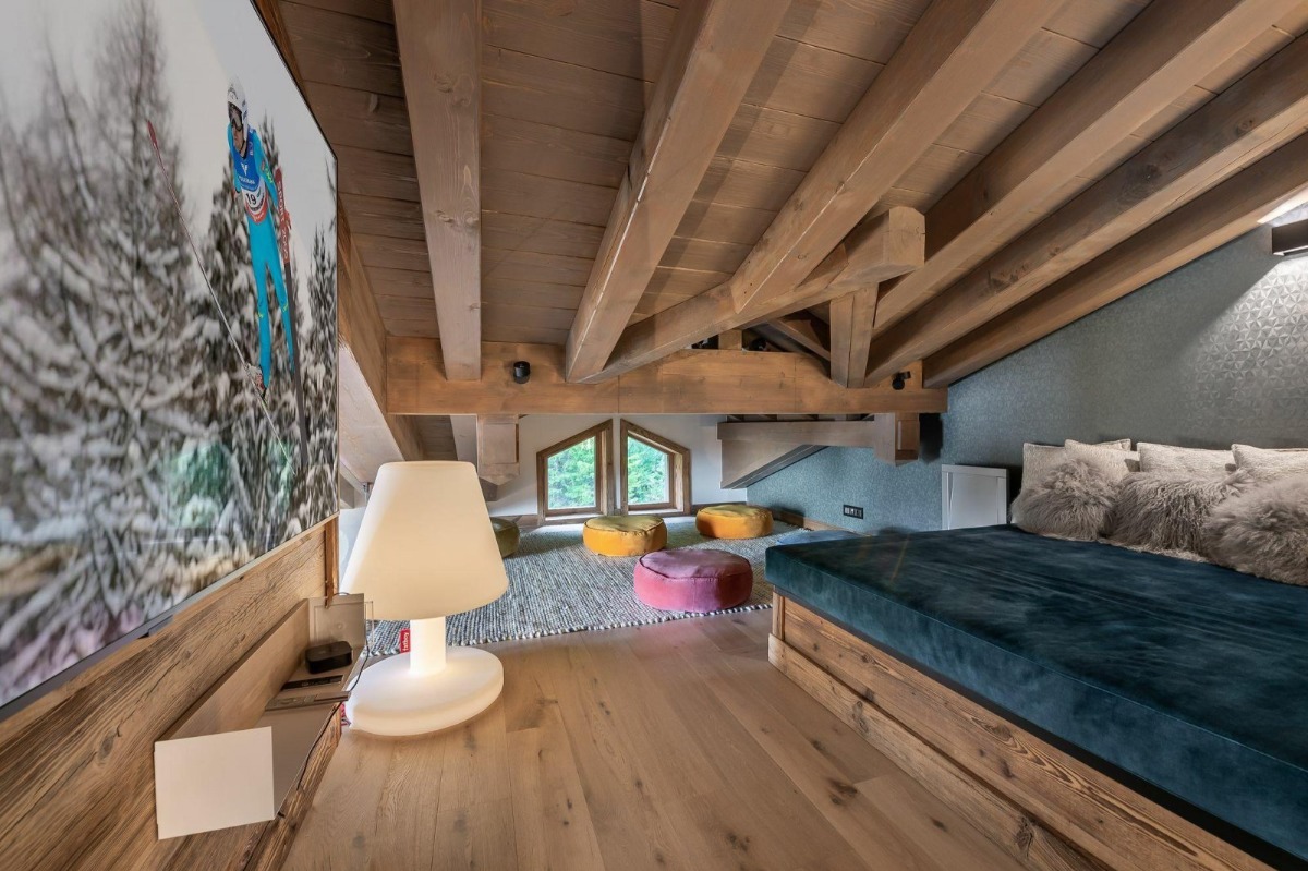 Шале отличается элегантным и теплым интерьером, отображающим коды настоящего альпийского стиля. Деревянные панели натуральных цветов, диваны XXL и шерстяные портьеры создают атмосферу. Жилое пространство распределено по четырем уровням, обслуживаемым лифтом. Это большое семейное шале предлагает шесть спален с ванными комнатами. Гостиная с соборным потолком, обогреваемая камином, большими окнами выходит на снежный пейзаж. Она соединена с террасой, где вы можете насладиться джакузи на открытом воздухе.