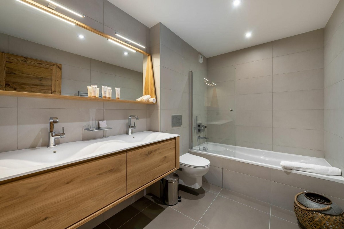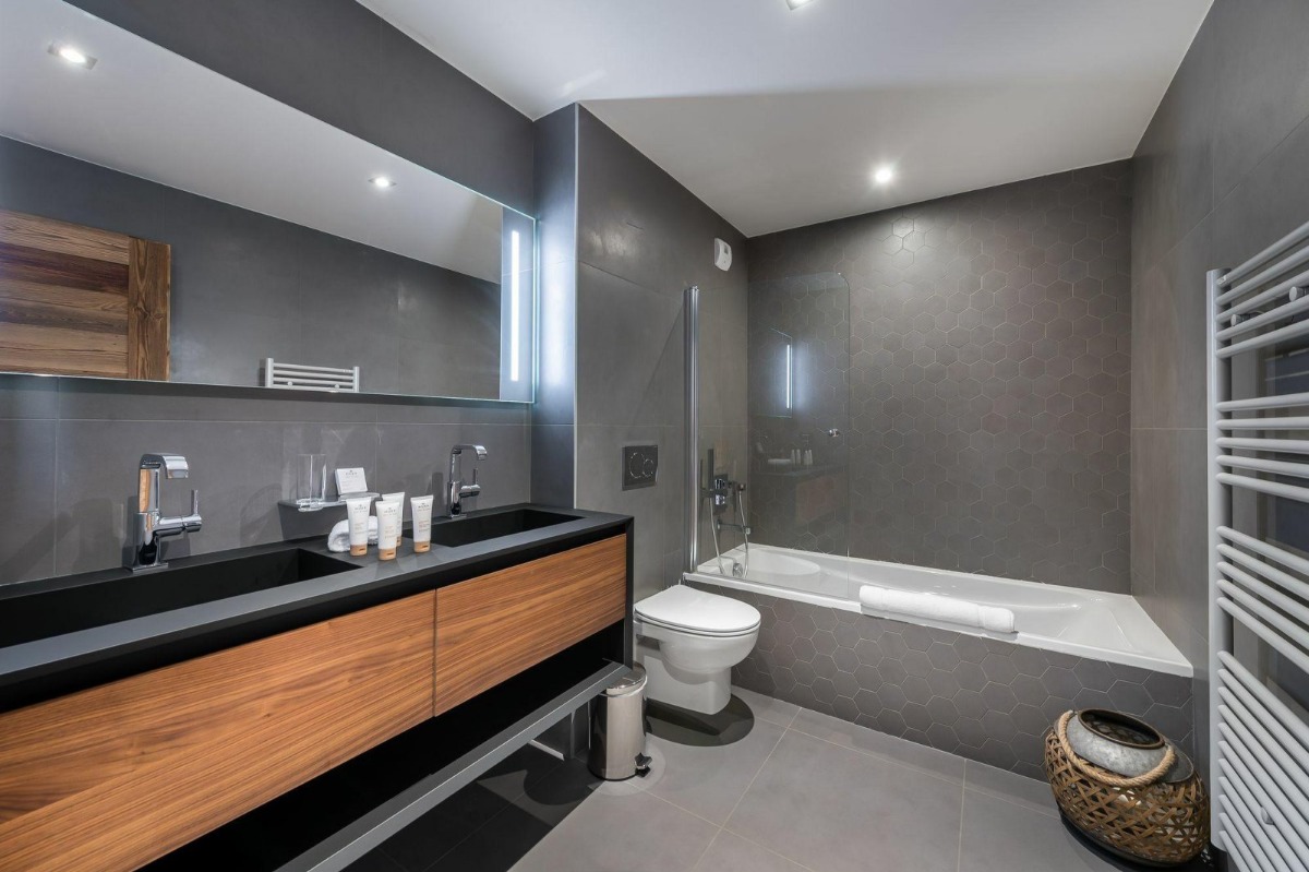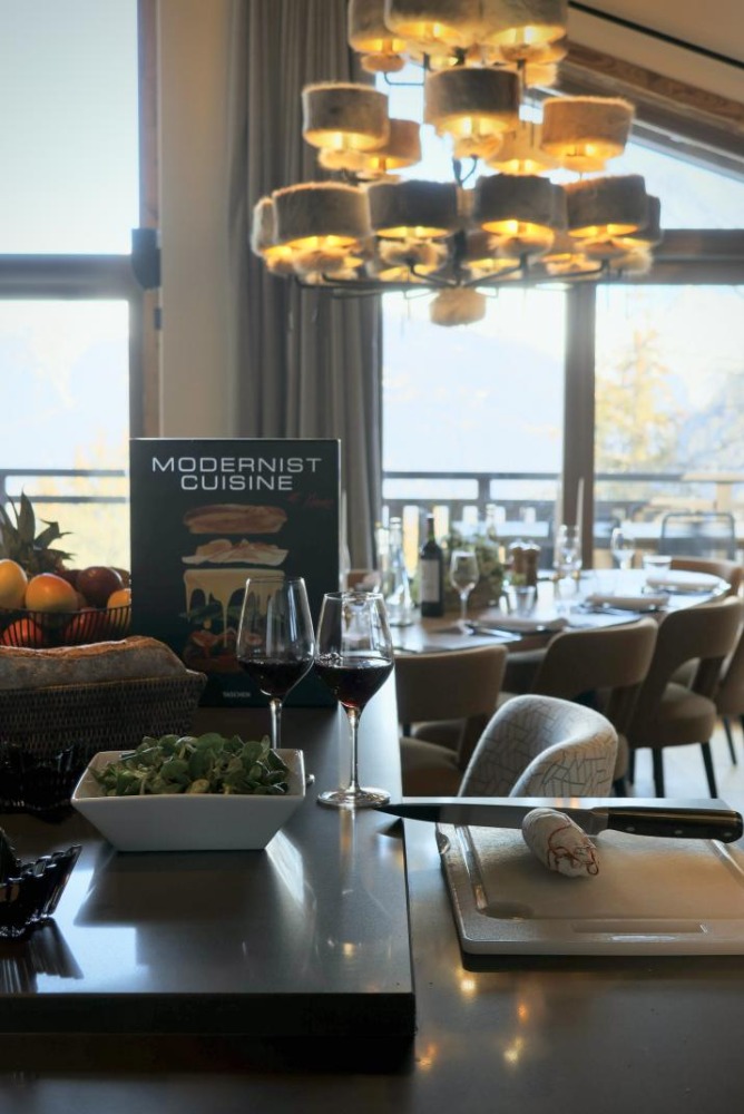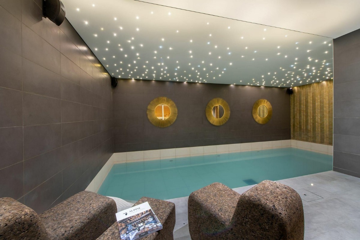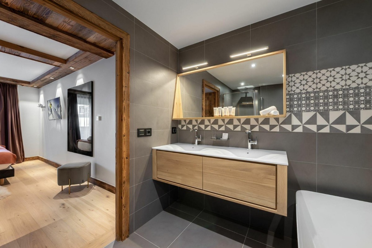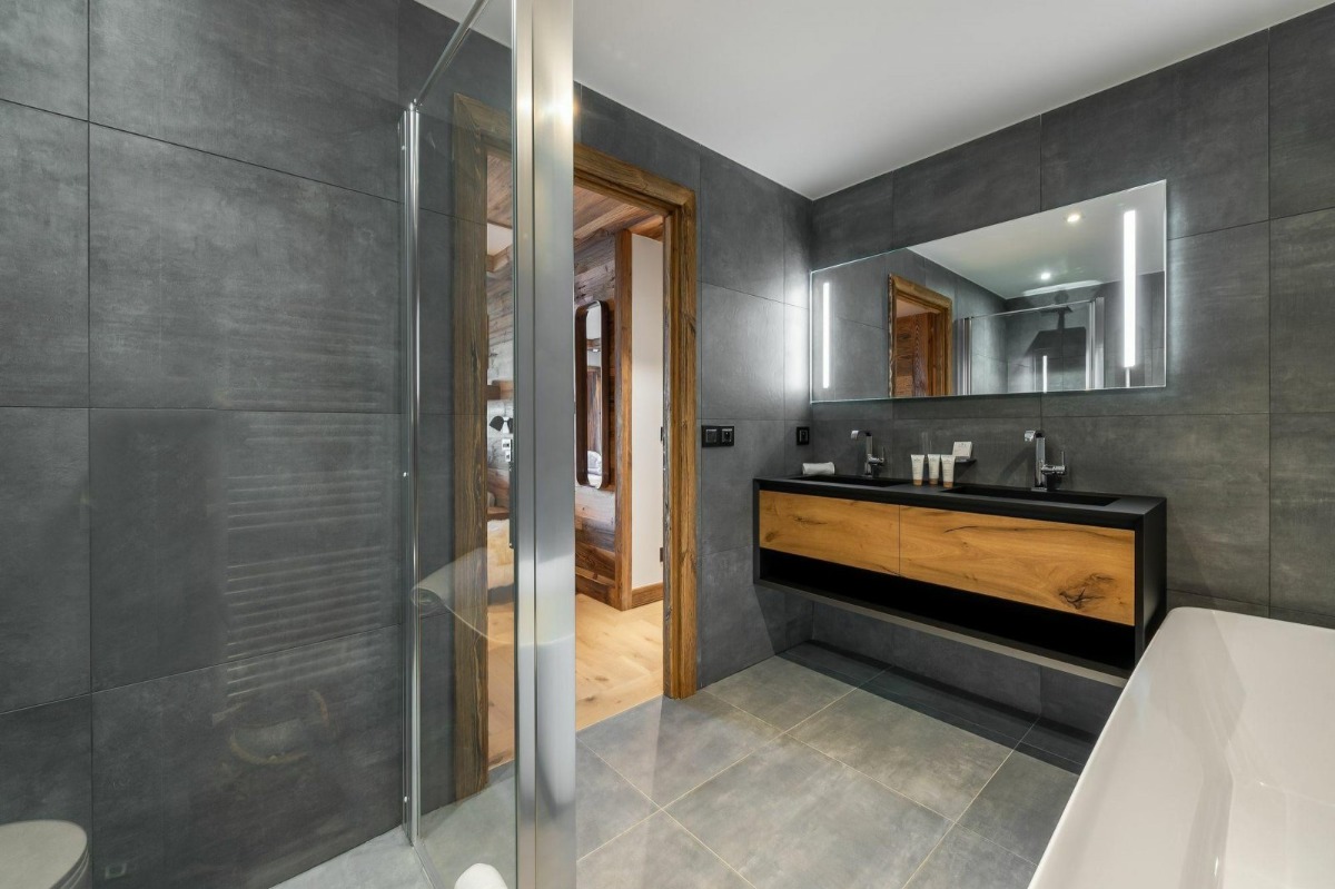 Шале отличается элегантным и теплым интерьером, отображающим коды настоящего альпийского стиля. Деревянные панели натуральных цветов, диваны XXL и шерстяные портьеры создают атмосферу. Жилое пространство распределено по четырем уровням, обслуживаемым лифтом. Это большое семейное шале предлагает шесть спален с ванными комнатами. Гостиная с соборным потолком, обогреваемая камином, большими окнами выходит на снежный пейзаж. Она соединена с террасой, где вы можете насладиться джакузи на открытом воздухе.
