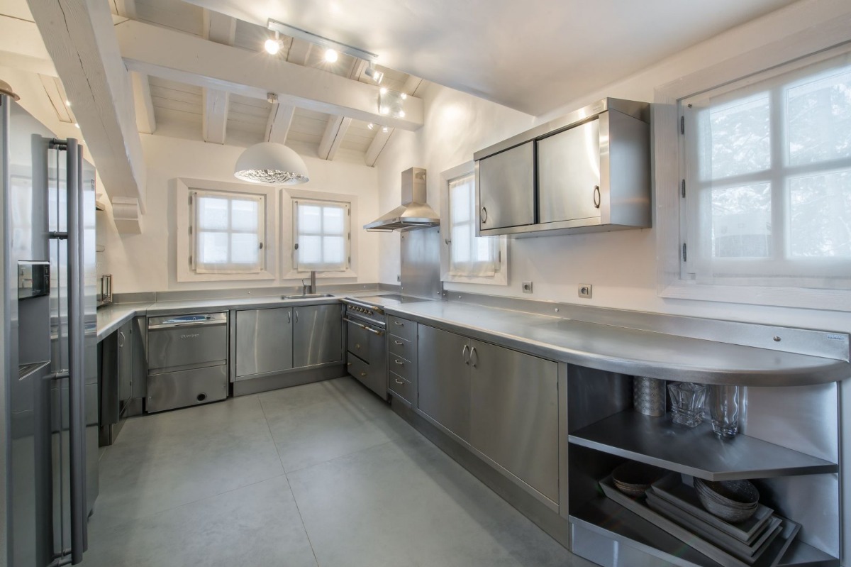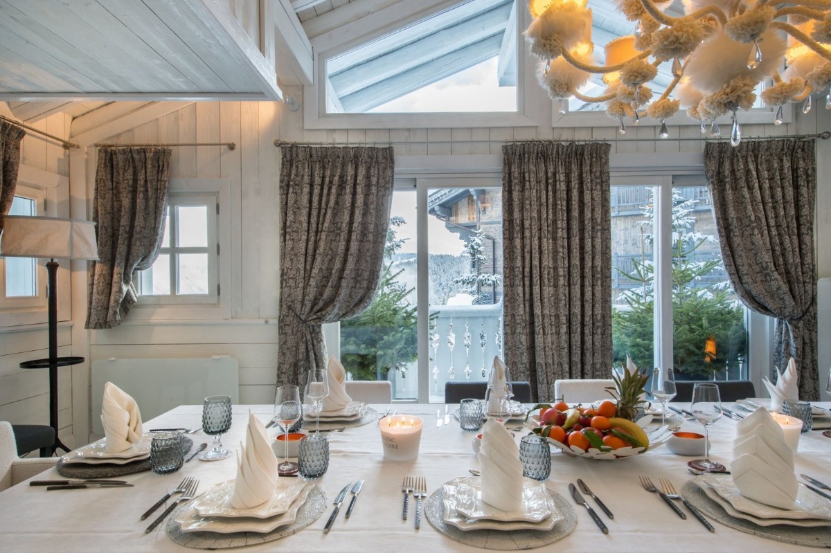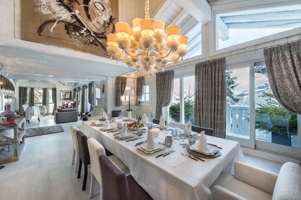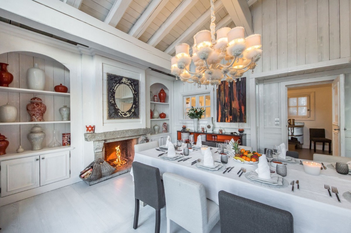 Рядом находится атмосферная столовая, где есть еще один потрескивающий огонь и потрясающая люстра для дополнительного ощущения уюта. Тактильная мебель и качественные материалы охватывают пространство, и все мелкие детали, от свечей до произведений искусства и уютного освещения, были учтены. На этом же этаже расположена профессиональная полностью оборудованная кухня, где гости могут приготовить вкусные блюда или воспользоваться помощью персонала для приготовления изысканных блюд.
