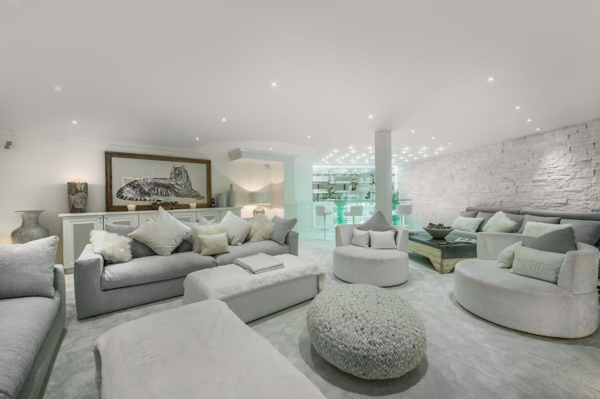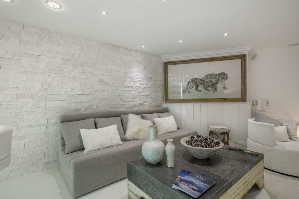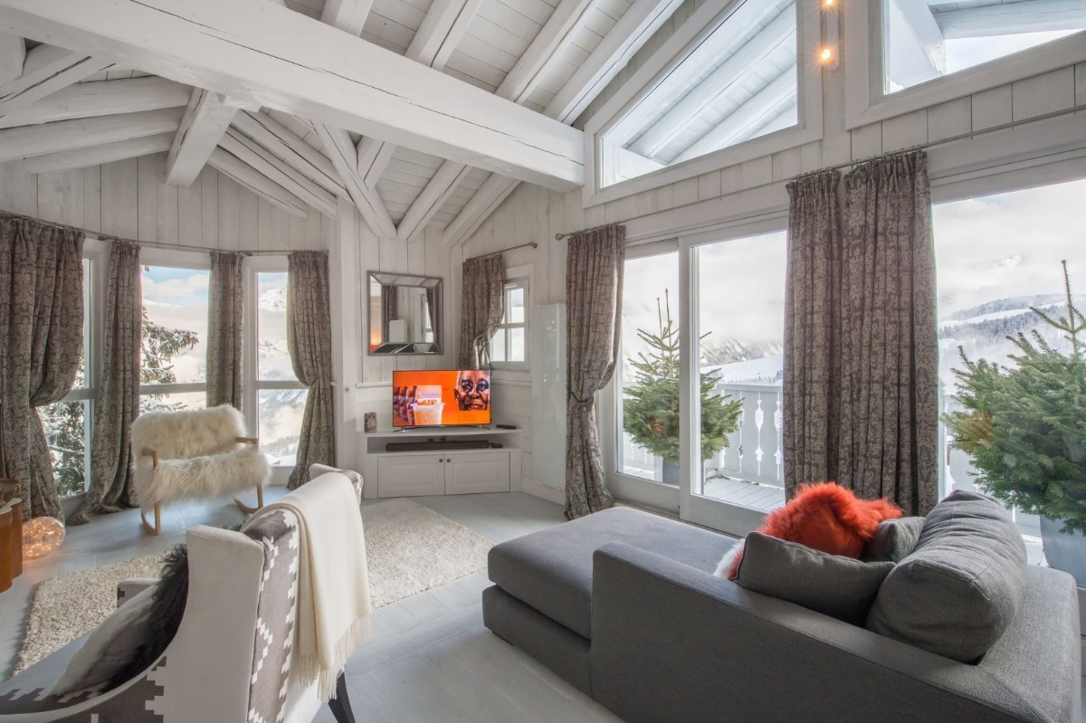Шале отличается уникальным интерьером, основанным на преимущественно белом цвете с вкраплениями драгоценных оттенков. Побеленные стены, пол и балки в гостиной успокаивают и создают домашний уют, а в «ледяном баре» и спа-центре создается эффект космополитизма и шика. В Альпах не может быть много лучше выглядящих шале.