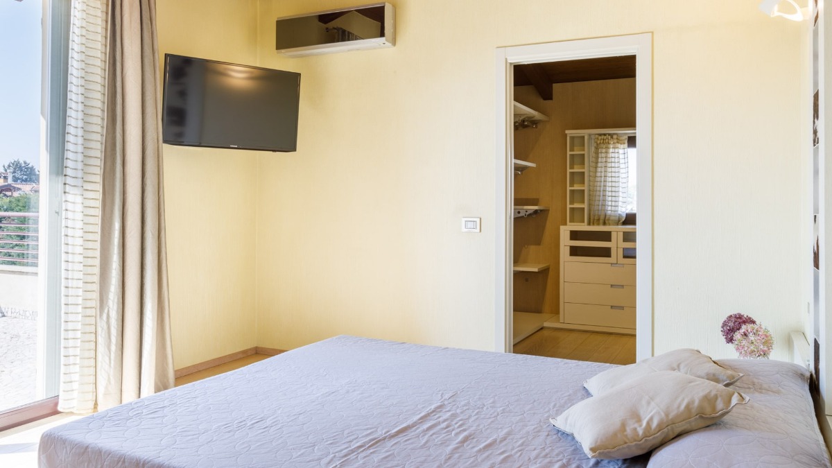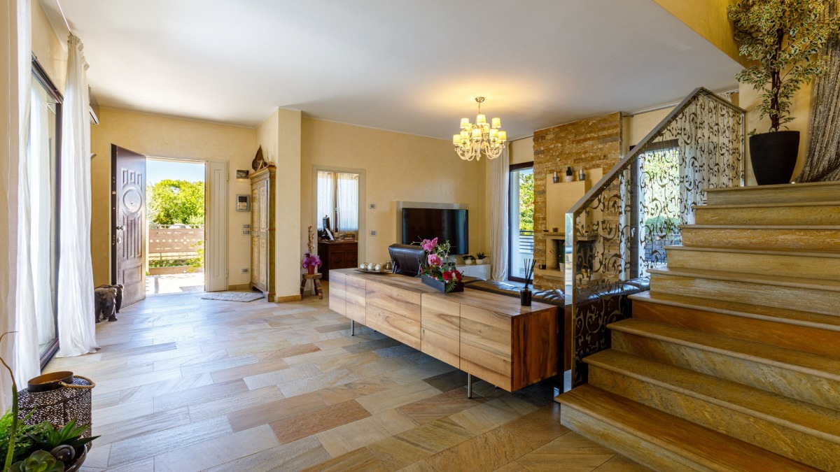 Вилла расположена на трех уровнях. Как только мы войдем в собственность, мы сразу же окажемся в большой гостиной, из которой мы находим кабинет сразу слева. Если мы продолжим движение вправо, то сначала обнаружим столовую, ведущую на кухню. Столовая также ведет к гостевой ванной комнате на этаже и к первой спальне с двуспальной кроватью с большой ванной комнатой с душем. Большая лестница ведет на второй этаж, где расположена основная спальная зона виллы. Вдоль коридора есть 3 спальни с двуспальными кроватями, одна из которых с ванной комнатой с душем, а две другие имеют общую ванную комнату с ванной. Та же лестница ведет на цокольный этаж, где находится оздоровительный СПА-центр, состоящий из бассейна неправильной формы площадью около 25 м2 и глубиной 1 м, очищенного кислородом, ступенчатый вход, джакузи, струи водопада и возможность подогрева. Спа дополняется сауной, душем и санузлом. Использование СПА должно быть запрошено за 2 дня. Также там есть прачечная.