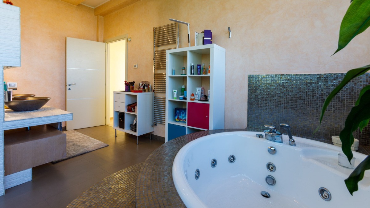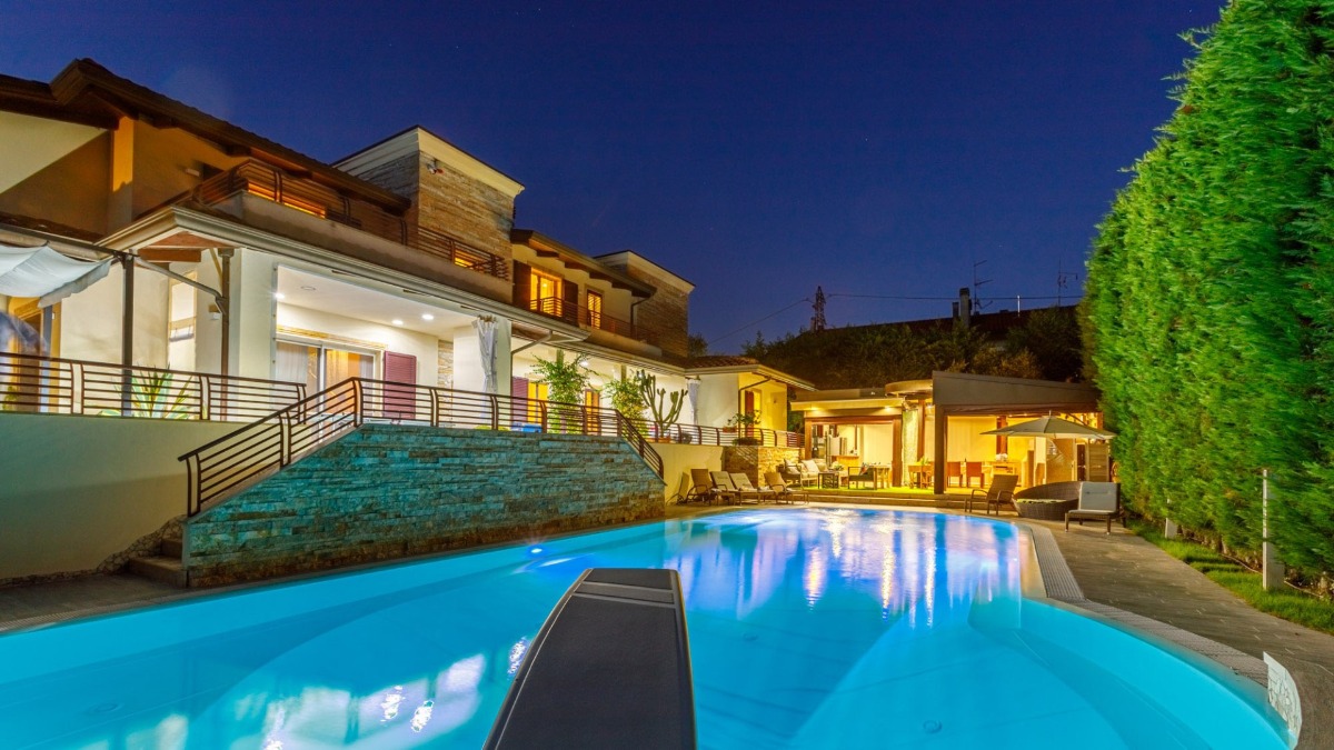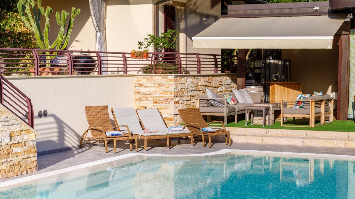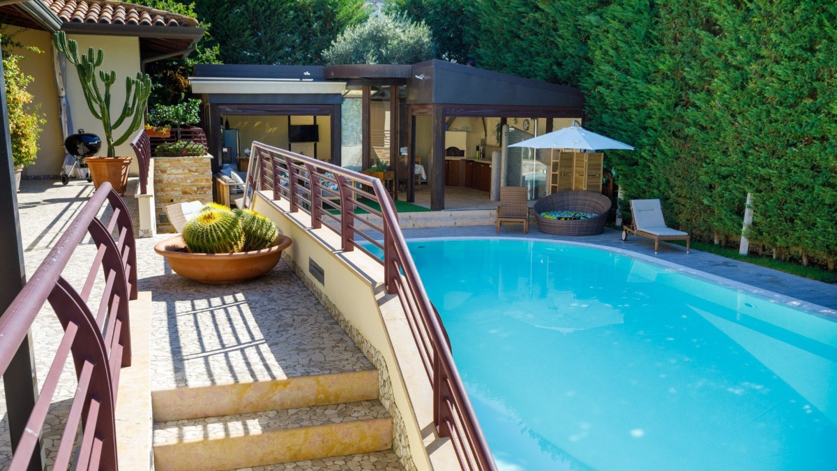 Открытый бассейн с подогревом, к которому можно подняться по лестнице с балкона, окружающего виллу, имеет площадь около 110 м2. Он имеет переменную глубину от 1,20 м до 2,20 м, очищен солью, облицован ПВХ, с внутренним и внешним освещением, и к нему можно попасть по большой римской лестнице. Бассейн оборудован внутренней гидромассажной зоной. Зона солярия вымощена керамогранитом и оборудована шезлонгами, диванами, креслами и красивым зонтиком.
