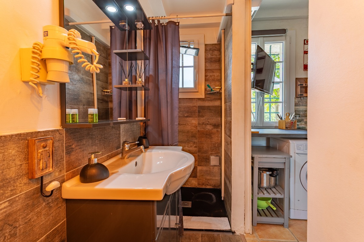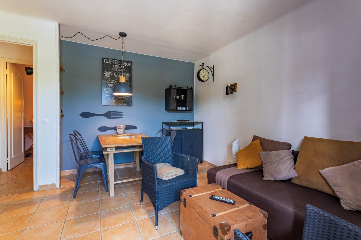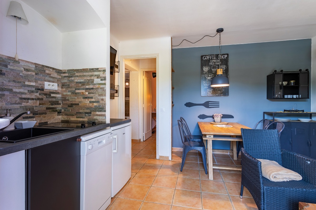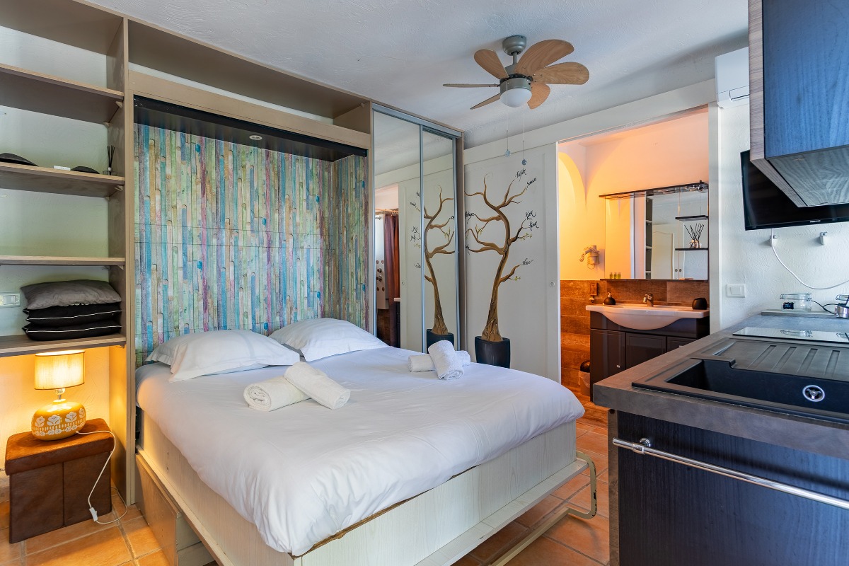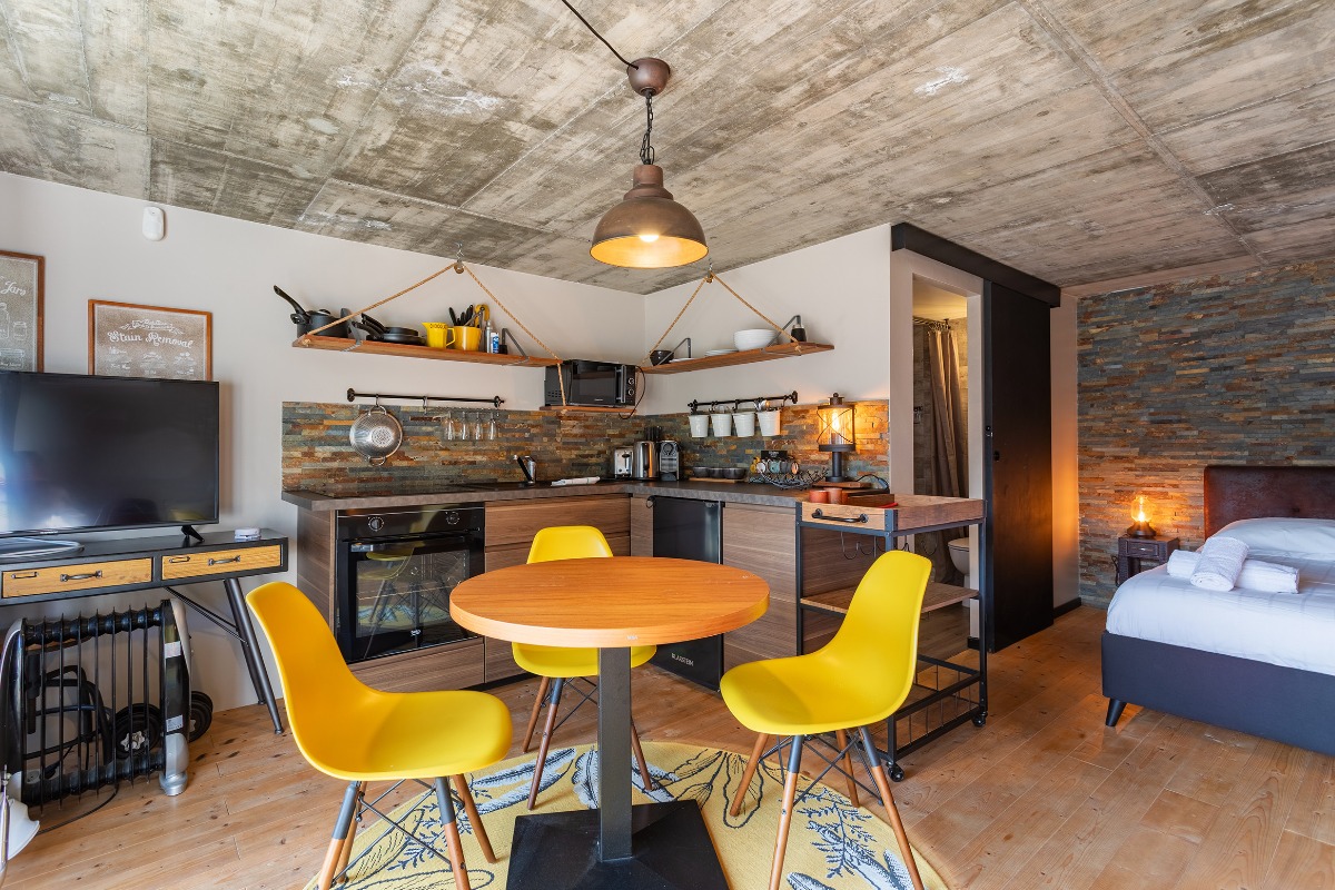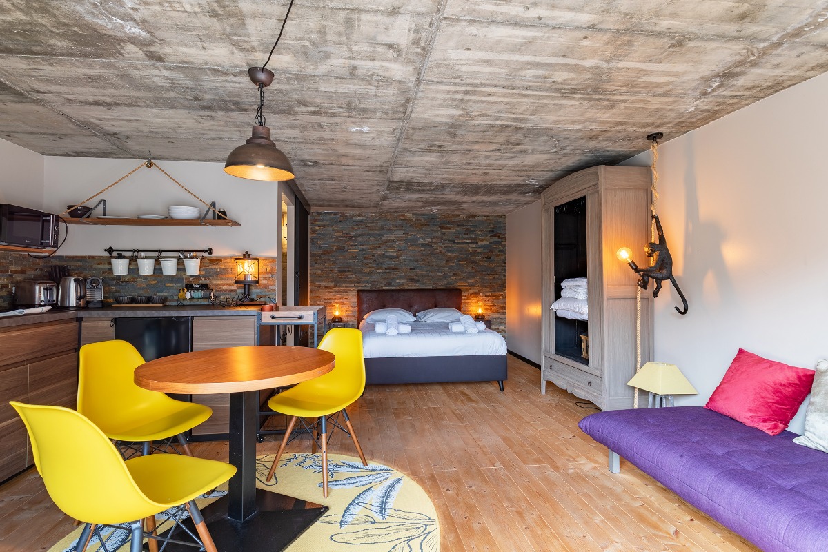 На нижнем уровне находятся 5 отдельных апартаментов (студии или двухкомнатные), каждый рассчитан на 2 гостей и оснащён: