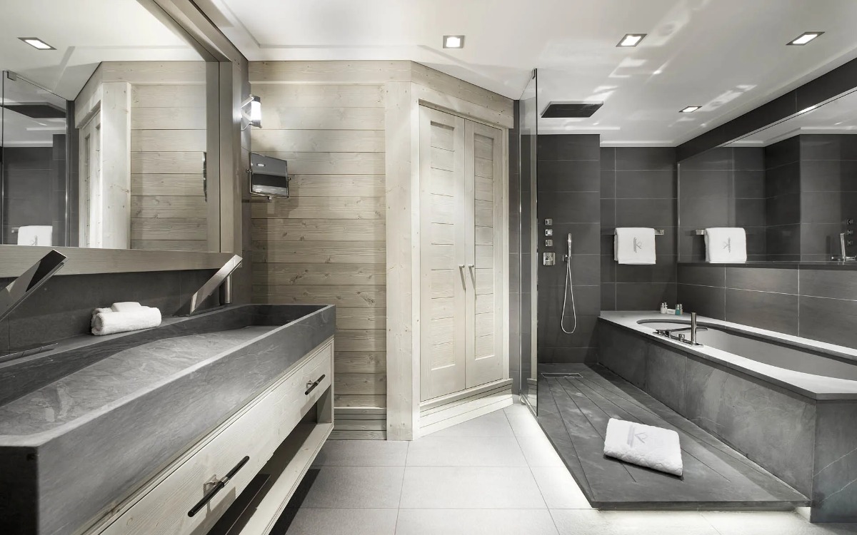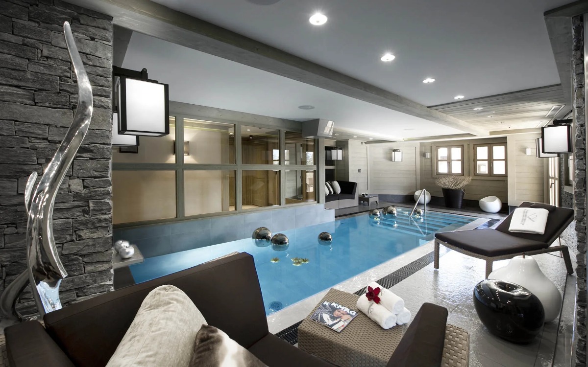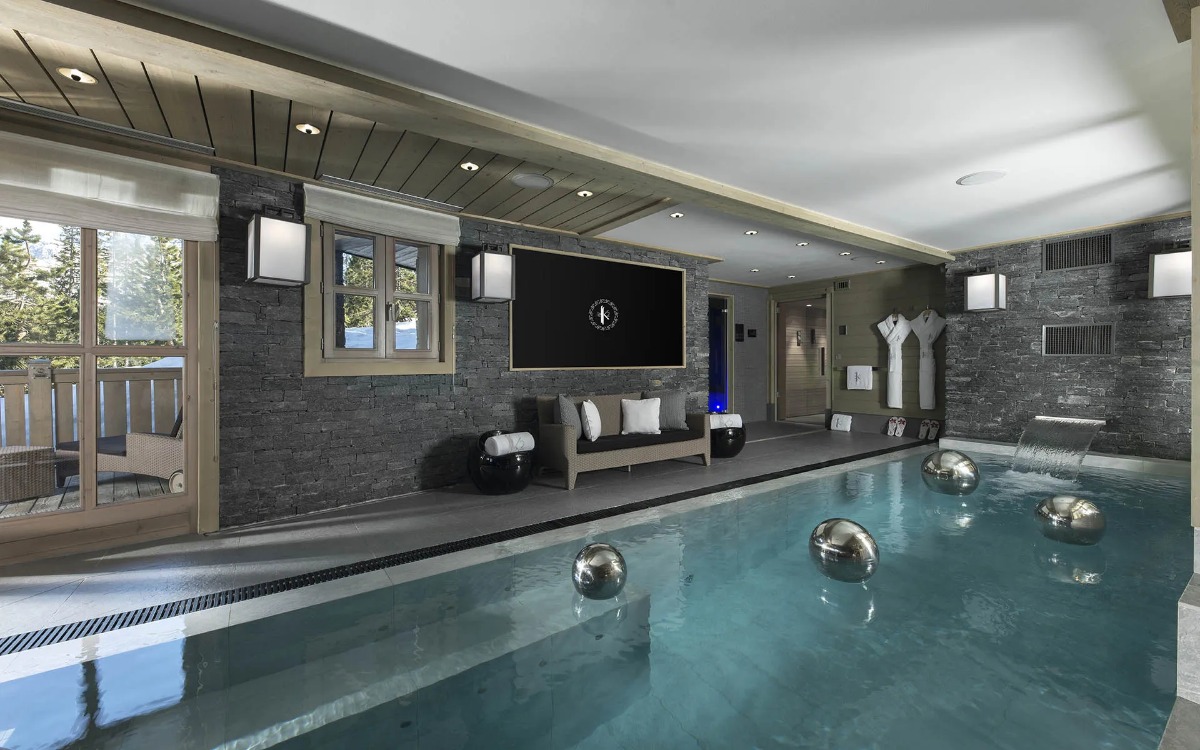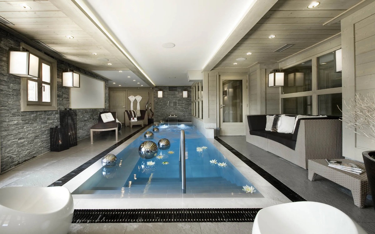 Направляясь на нижний уровень шале, вы будете рады открыть для себя невероятную частную спа-зону. Центральное место в этой спа-зоне занимает великолепный крытый бассейн шале с водопадом и системой противотока, позволяющей плавать постоянно. Вокруг спа-центра установлены удобные кресла для отдыха, где вы также можете выбрать сауну и хаммам, где можно восстановить силы и расслабиться.