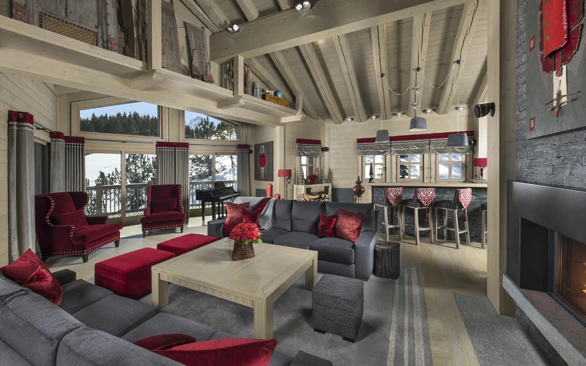 Третий этаж шале — это его главный жилой этаж, просторная комната открытой планировки, где вы найдете несколько зон отдыха, главная из которых наслаждается уютным теплом камина; большая столовая; а также бар с пианино. Над этим этажом находится только мезонин, а это означает, что в основной жилой зоне высокие потолки из светлого дерева придают комнате классическую альпийскую атмосферу. Остальная часть пространства приобретает более особый стиль: качественная роскошная мебель темно-сланцевого и королевского красного цвета, а также специальные произведения искусства и диковинки, напоминающие о наследии и стиле горного хребта Каракорум. Этот этаж выходит на просторный балкон с видом на склоны, что позволяет воспользоваться преимуществом расположения шале со стороны трассы.