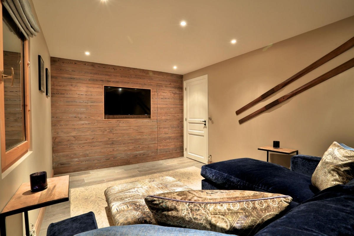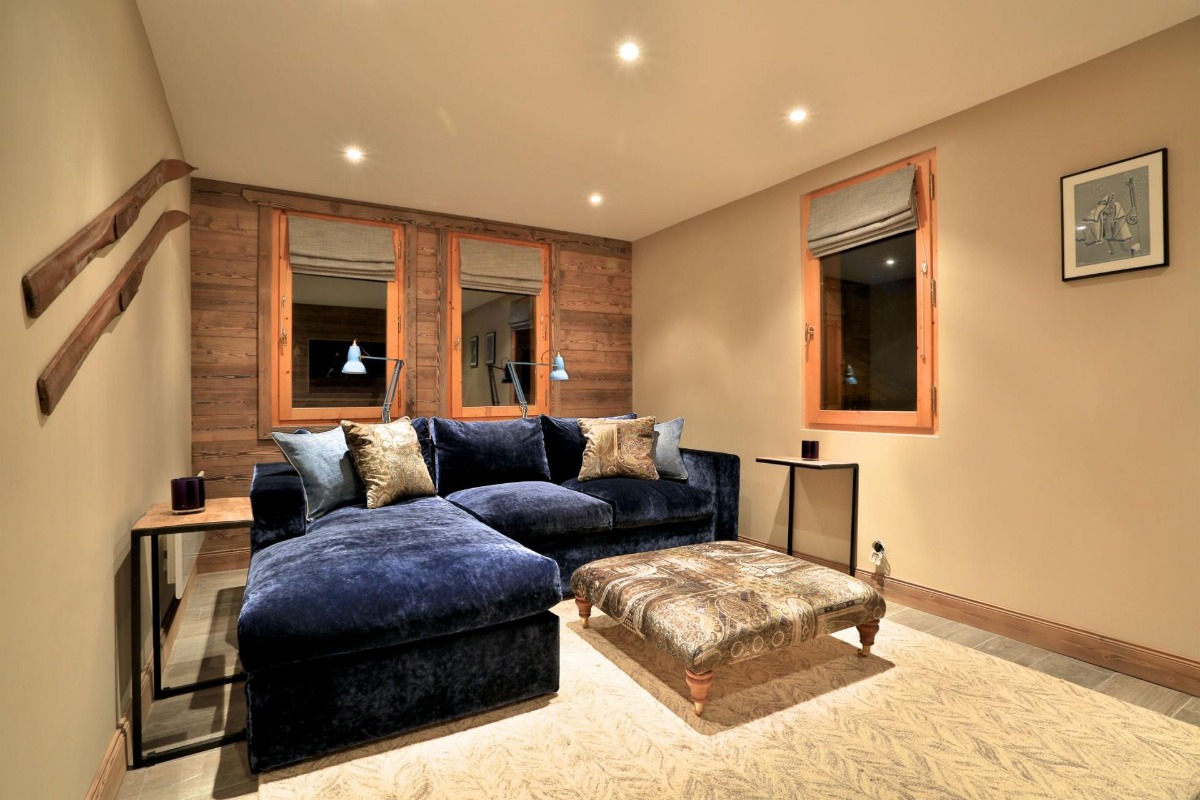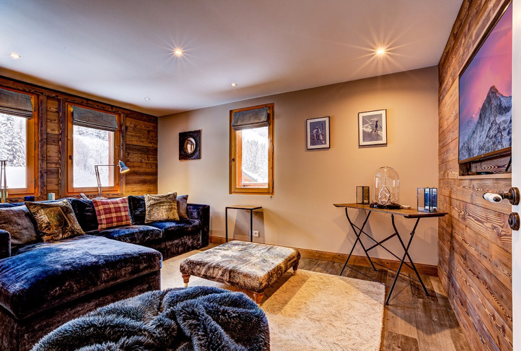 На входе в шале вас встречает светлое, современное и красочное жилое пространство открытой планировки. Роскошная мебель привлекательна и создает желанную зону отдыха в конце долгого дня на трассах. Уютный лаундж с телевизором — отличное отдельное место, где можно расслабиться, почитать книгу или посмотреть фильм.