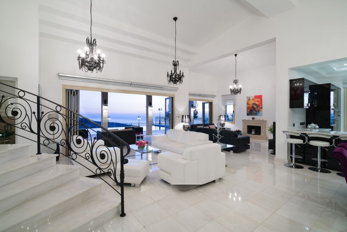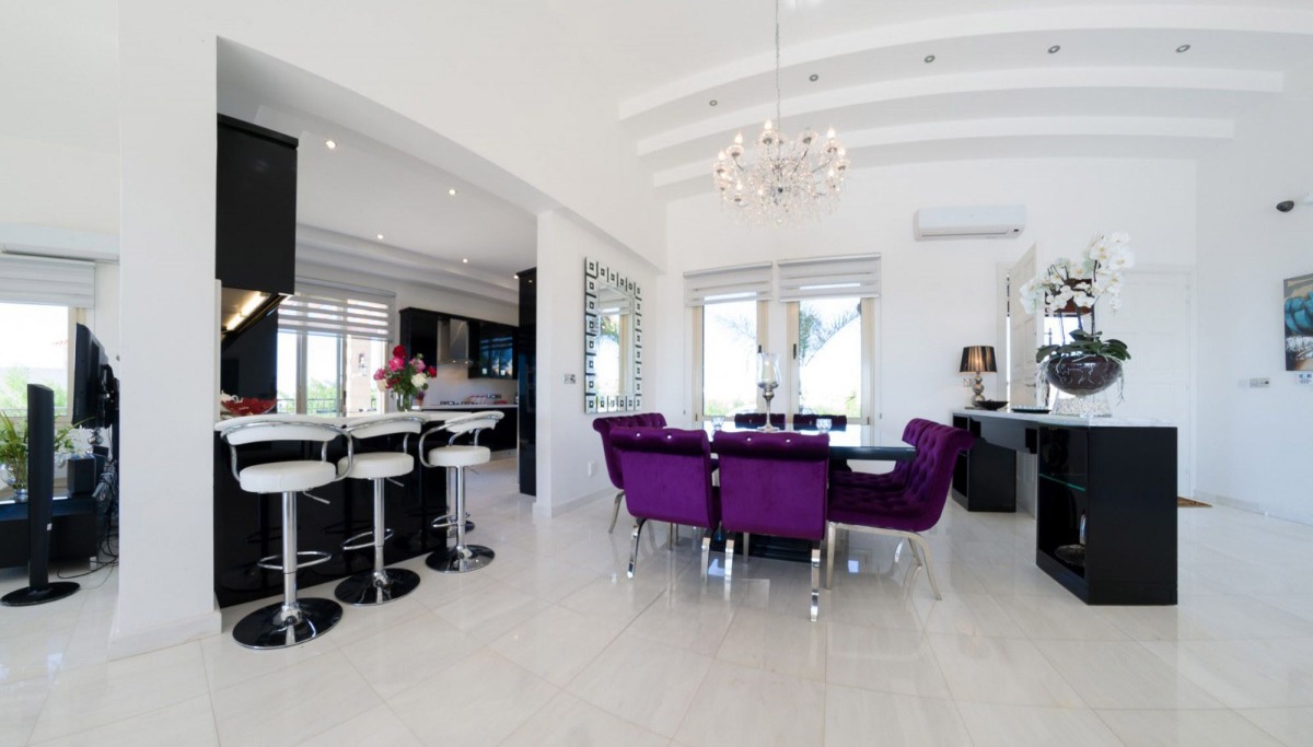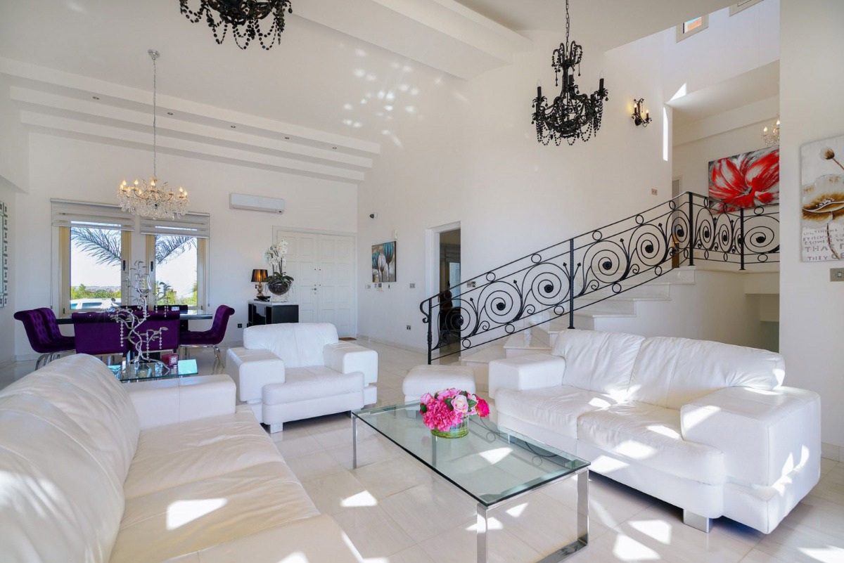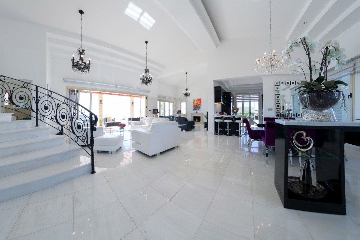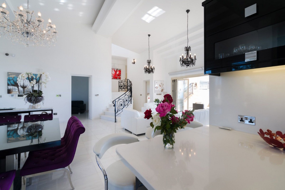 Большой вход с воротами ведет на виллу. Войдя на виллу, вы сразу же обратите внимание на элегантно обставленную гостиную открытой планировки с обеденной зоной, двумя зонами отдыха с диванами, камином, интернет-телевидением и DVD-плеером. Современная полностью оборудованная кухня оснащена техникой Bosch и Miele, а барная стойка с 4 стульями отделяет гостиную от кухни.