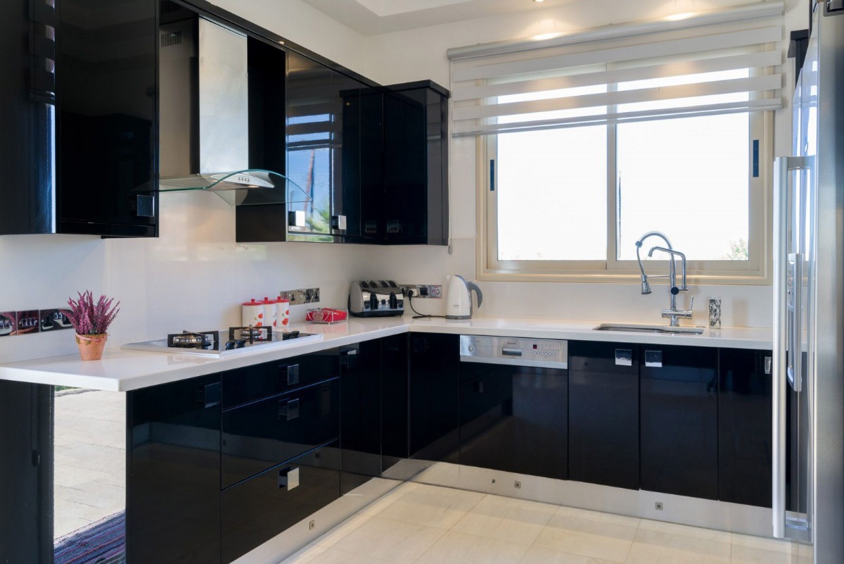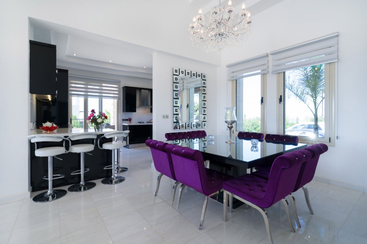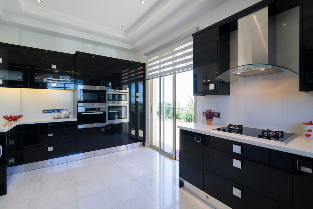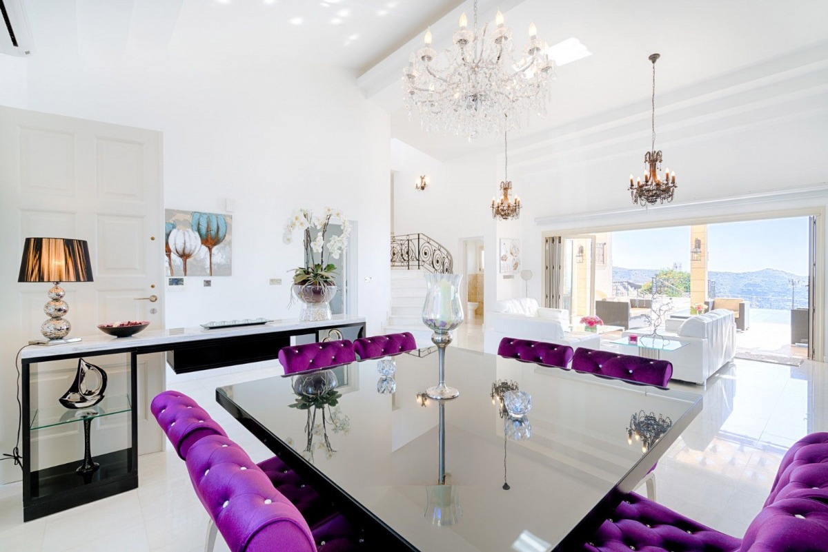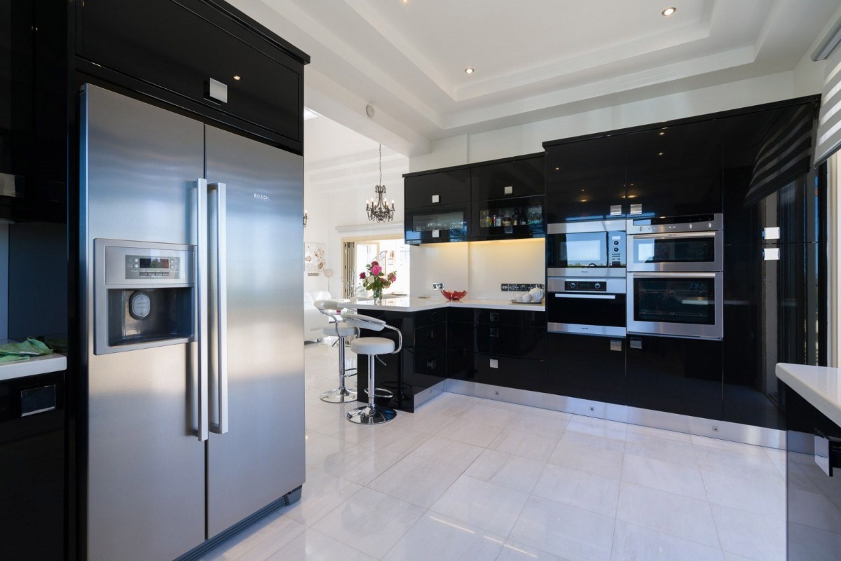 Большой вход с воротами ведет на виллу. Войдя на виллу, вы сразу же обратите внимание на элегантно обставленную гостиную открытой планировки с обеденной зоной, двумя зонами отдыха с диванами, камином, интернет-телевидением и DVD-плеером. Современная полностью оборудованная кухня оснащена техникой Bosch и Miele, а барная стойка с 4 стульями отделяет гостиную от кухни.