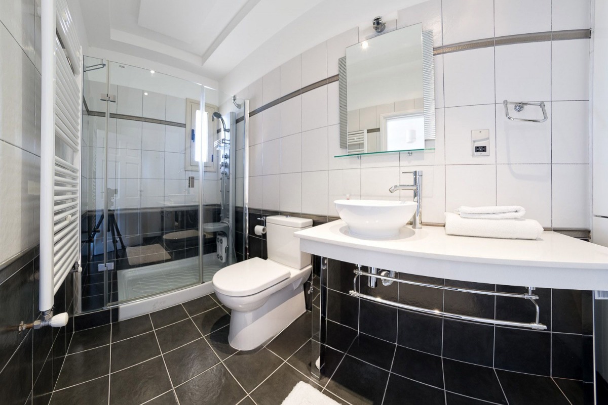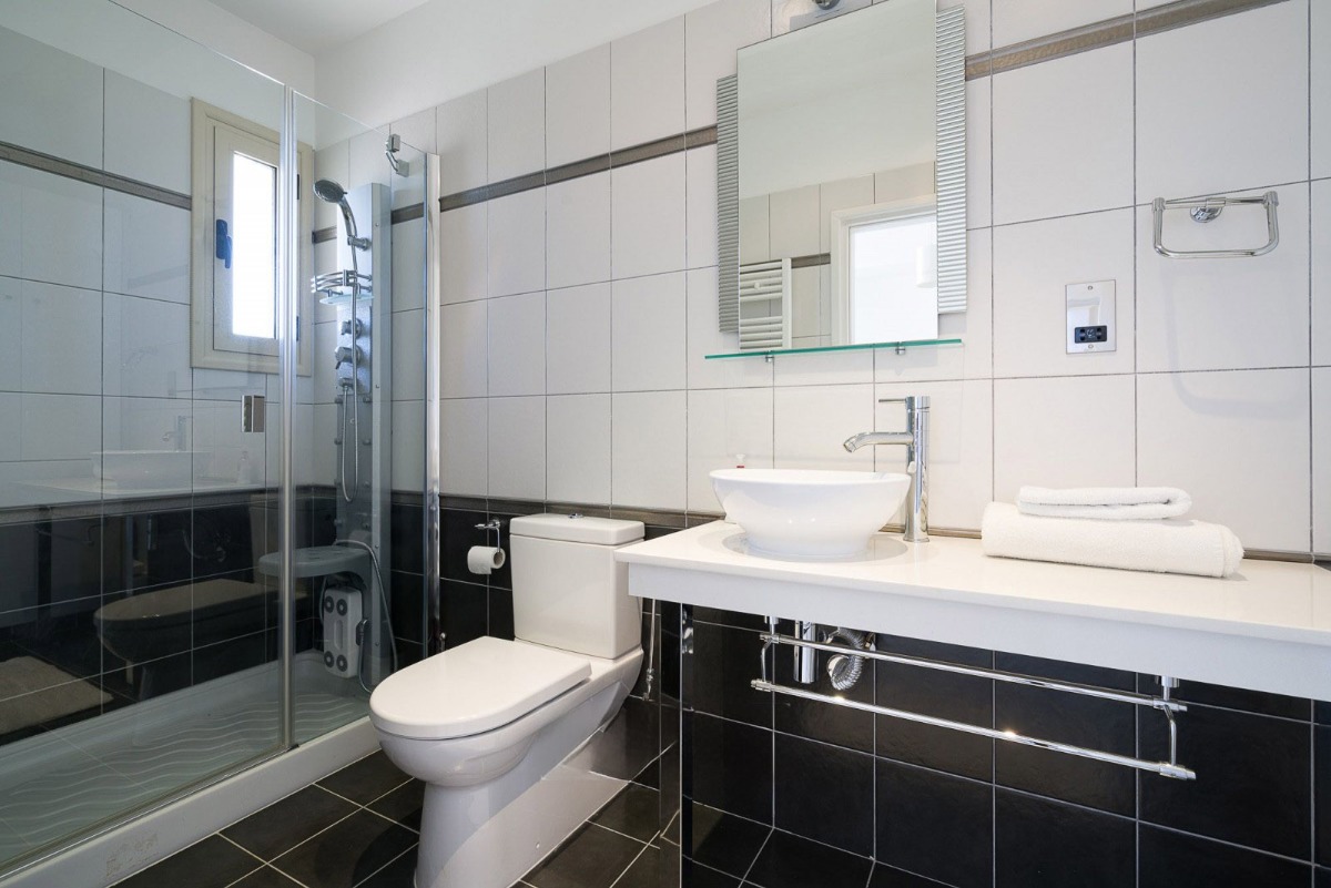 Спустившись на цокольный этаж, вы найдёте спальню с двуспальной кроватью, душевой комнатой и мини-кухней. Отдельный вход из этой спальни ведёт на улицу, а оттуда по лестнице можно попасть к бассейну и террасе. Последняя спальня виллы расположена на этом этаже и оборудована двухъярусной кроватью (двуспальная кровать с односпальной кроватью сверху) и собственной душевой комнатой.