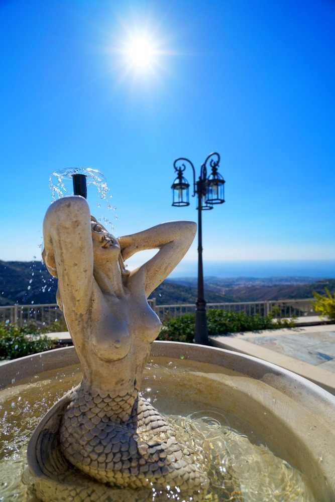 Раздвижные двери из гостиной ведут на меблированную террасу, к ландшафтному саду и бассейну-инфинити размером 12 х 6 м (глубина от 0,55 до 1,8 м) с лестницей. Несколько ступенек с террасы ведут на террасу с джакузи, вмещающей до 10 взрослых человек, и ещё одной террасой для загара.