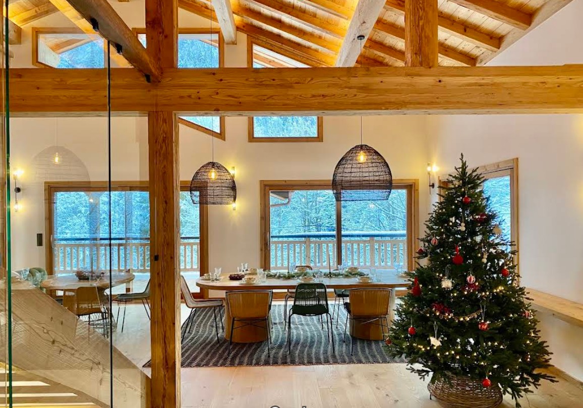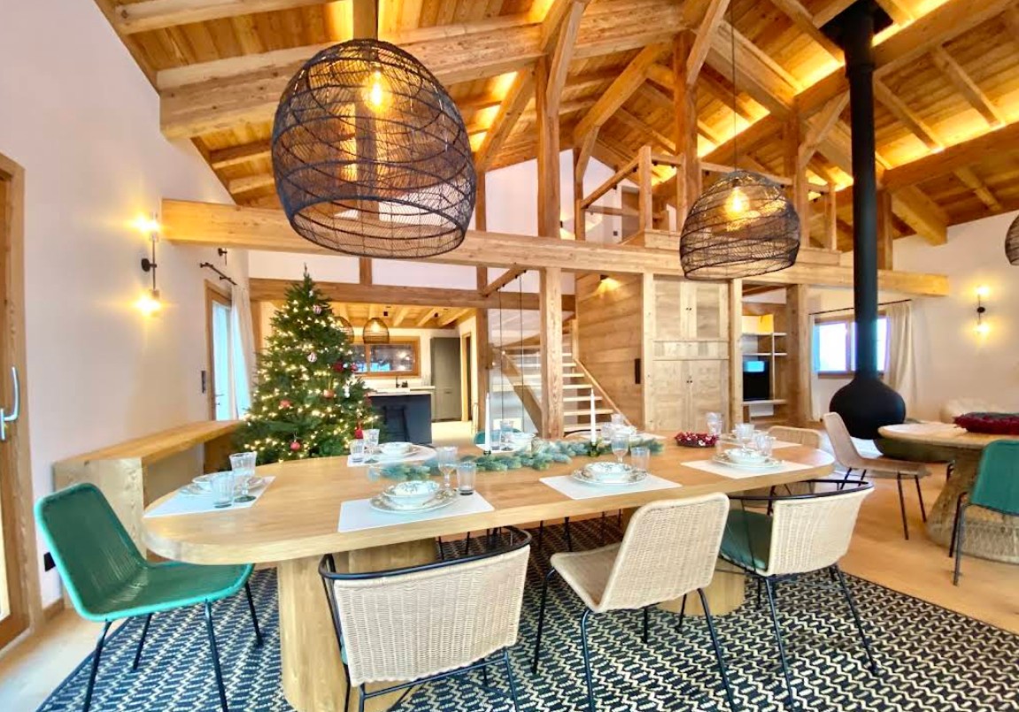 На третьем этаже этого шале находится главная гостиная с впечатляющими сводчатыми потолками и открытыми деревянными балками. Яркий подвесной камин наполняет теплом всю гостиную. Благодаря уникальным мягким диванам, это пространство создает уютную атмосферу для встреч всей компанией после дня, проведенного в горах. Большие панорамные окна открывают потрясающий вид на лес и долину, наполняя дом красотой природы. Чтобы ощутить более тесную связь с природой, выйдите на балкон и полюбуйтесь видом на долину и реку Дранс. Рядом с гостиной расположен обеденный стол, идеально подходящий для совместных обедов. На полностью оборудованной кухне вы найдете все необходимое для приготовления вкусных блюд во время вашего пребывания.