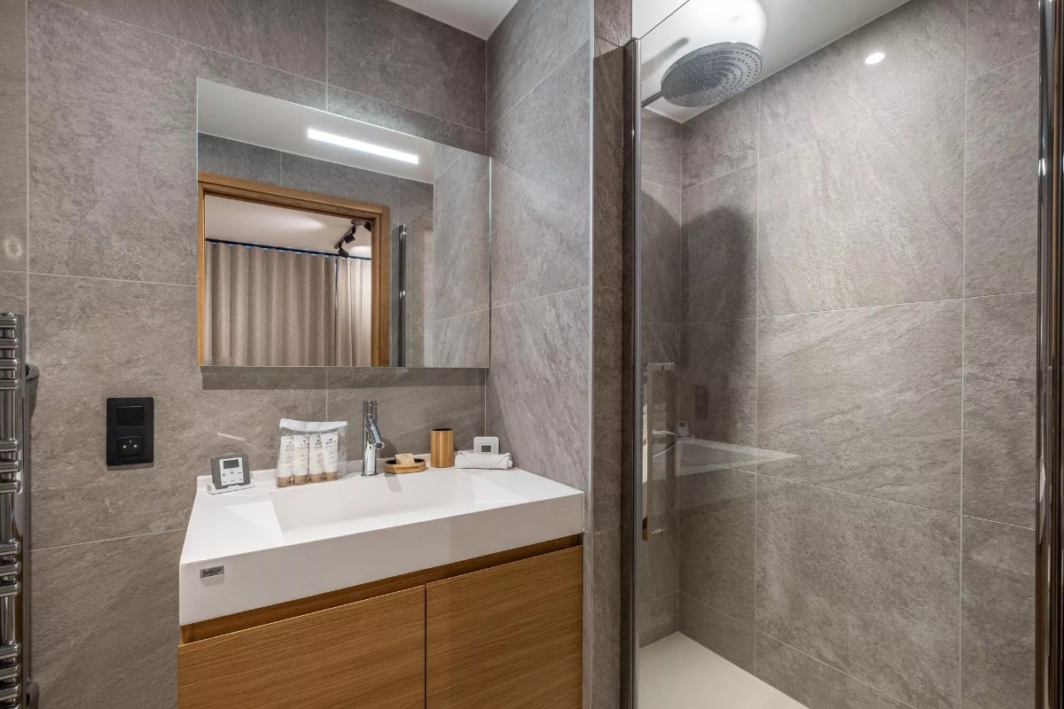 В просторных апартаментах площадью 136 м² с комфортом разместятся 6 взрослых и 2 детей. В апартаментах есть главная спальня с двуспальной кроватью, диваном-кроватью и собственной ванной комнатой, семейная спальня с двуспальной кроватью и двухъярусными кроватями, а также собственной ванной комнатой, и спальня с двуспальной кроватью и террасой. Душевая комната и отдельный туалет дополняют спальную зону.