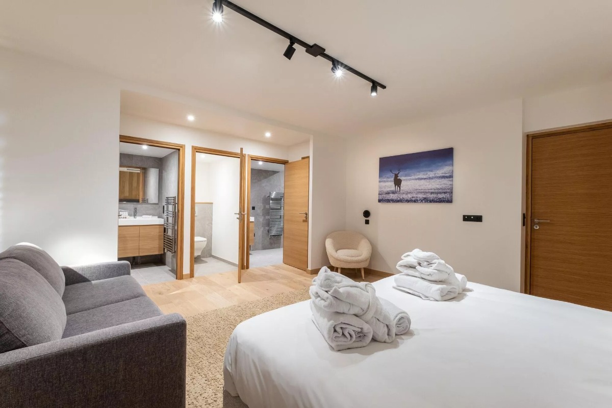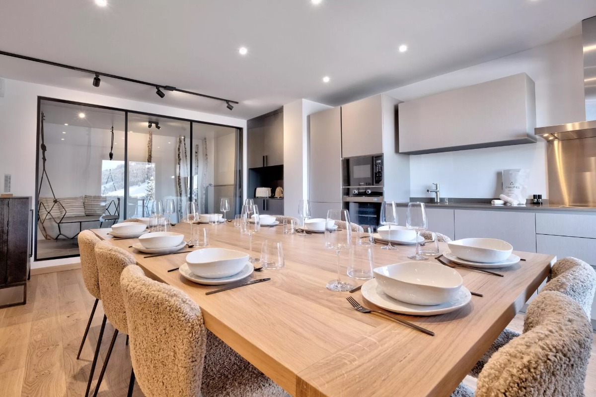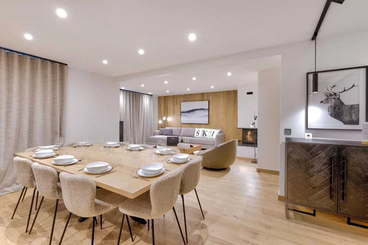 В жилой зоне есть гостиная с камином, полностью оборудованная кухня и обеденная зона. Как и все дома в резиденции, эти паартаменты отличается высококачественной отделкой и современной, уютной атмосферой. Вы также оцените террасу, на которую можно выйти из гостиной, и балконы спален, с которых открывается панорамный вид на долину Куршевель и горы Вануаз!