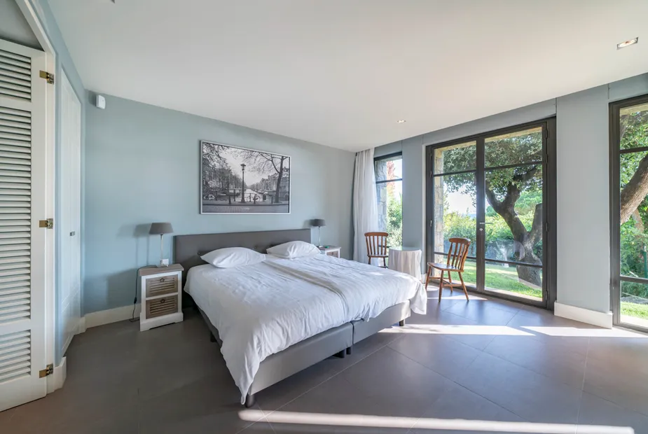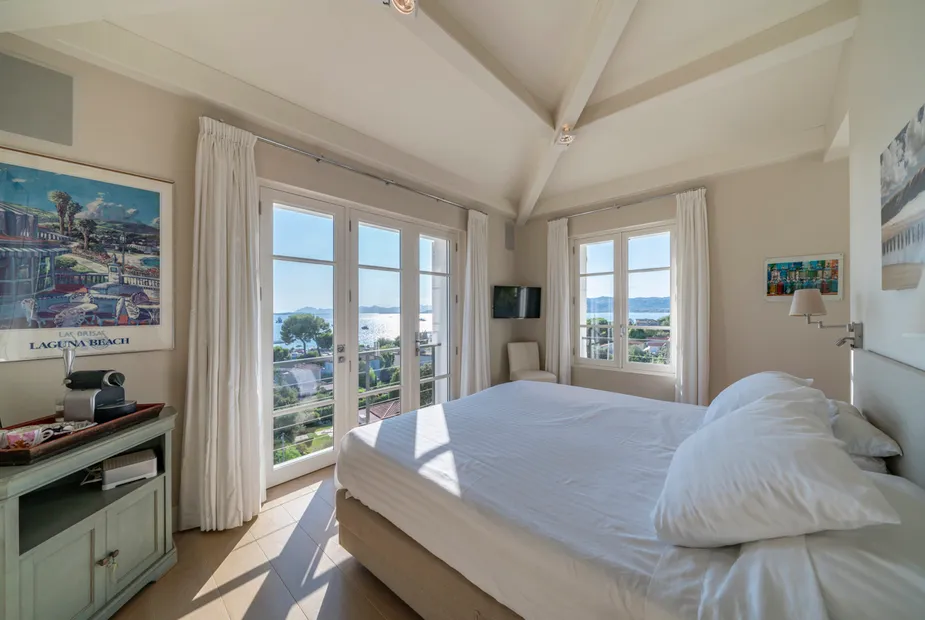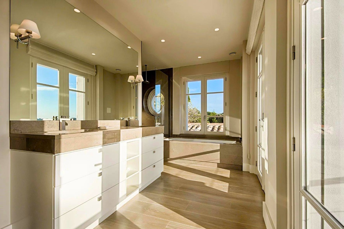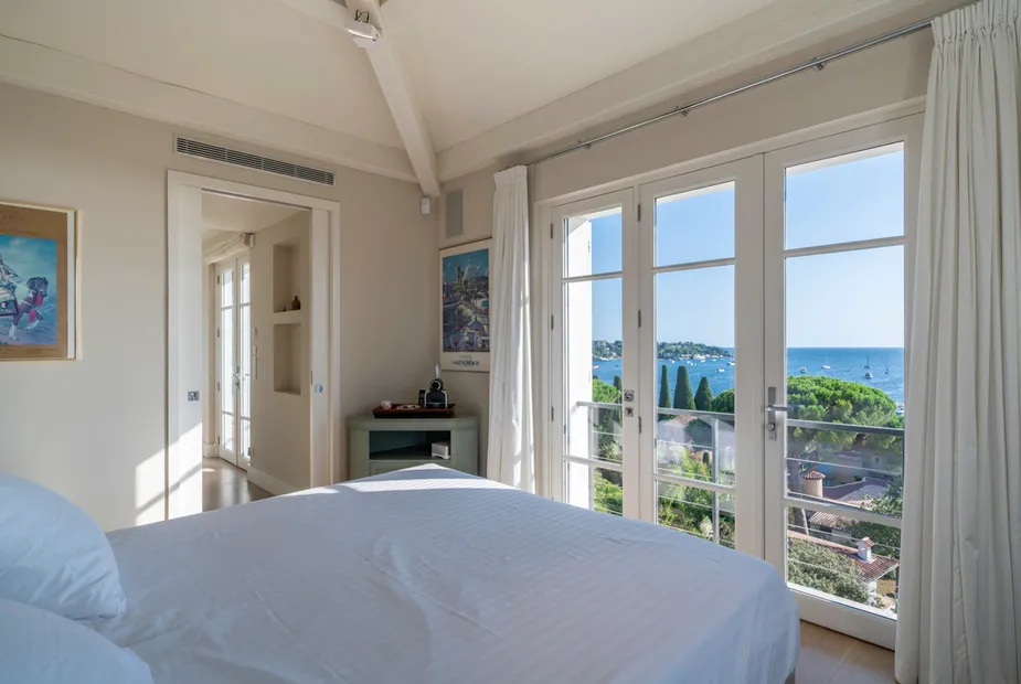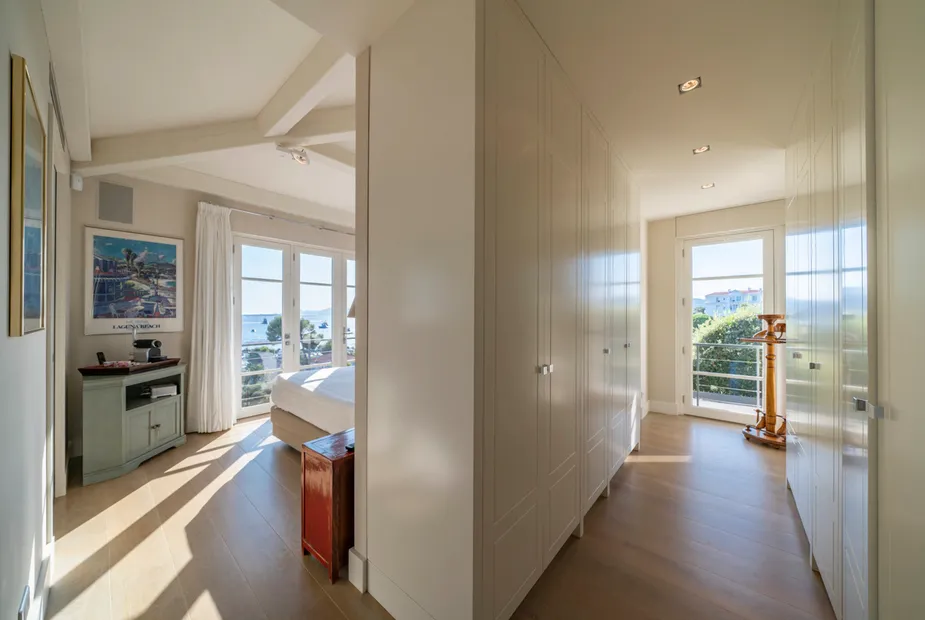Вилла выстроена на пяти уровнях, и с каждым этажом виды становятся всё более впечатляющими. На верхнем уровне расположена главная спальня — по-настоящему эффектное пространство с собственной гардеробной и ванной комнатой, из которой открывается вид на порт и сверкающее море. Это место, где утро начинается с горизонта, а вечер — с огней побережья.