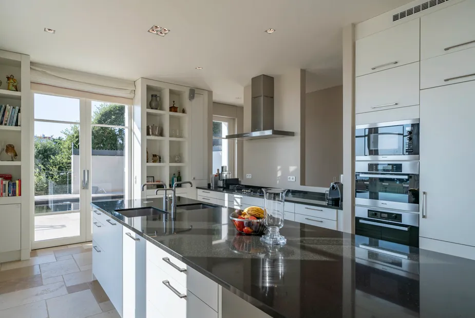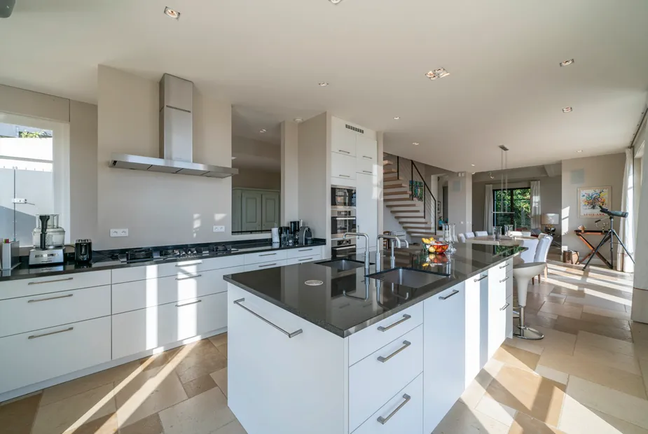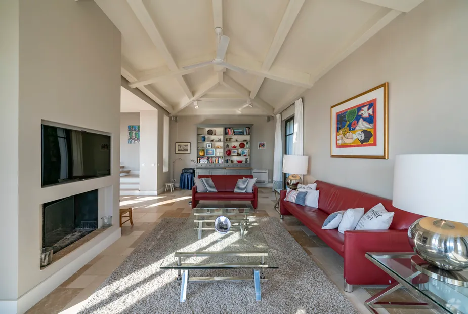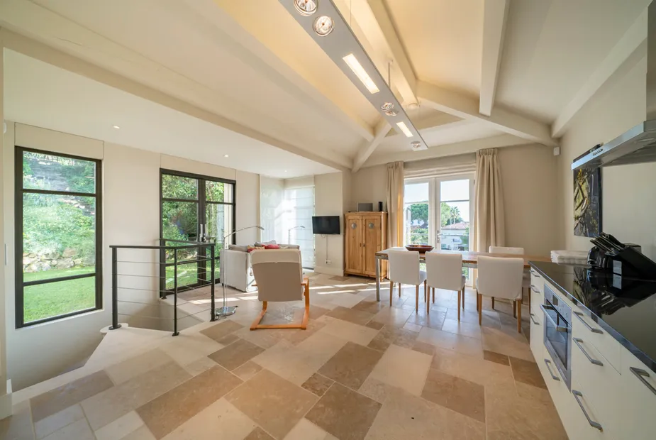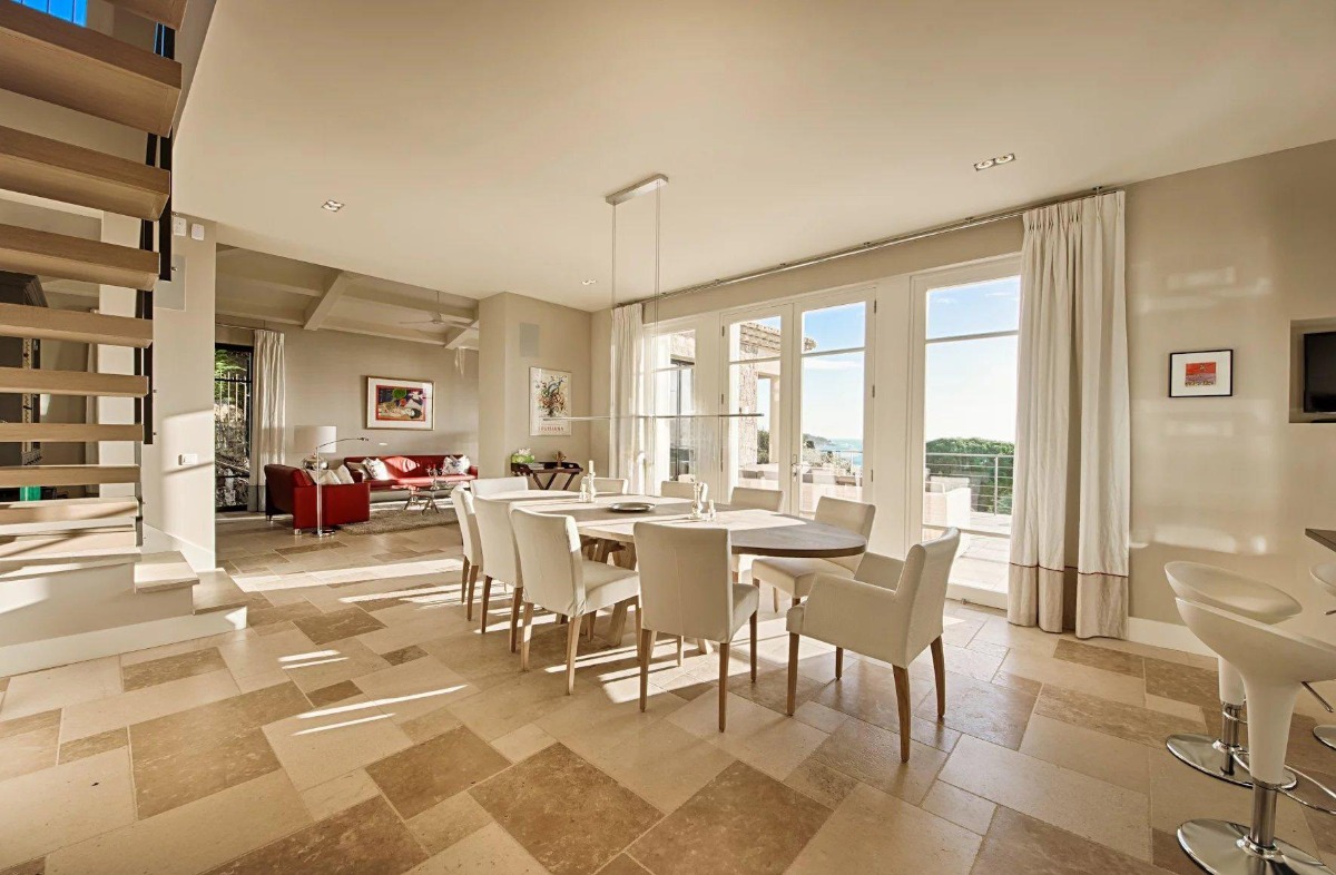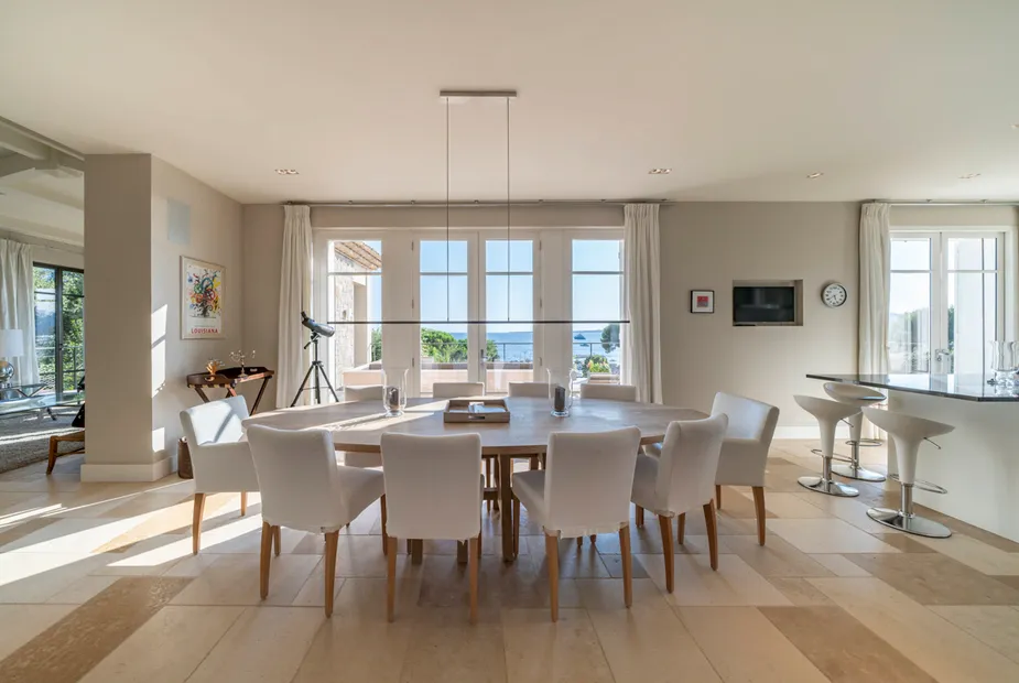 Ниже располагается сердце дома — стильная гостиная и столовая открытой планировки, объединённые с современной, полностью оборудованной кухней. Панорамные двери ведут на просторную террасу с видом на море, где предусмотрено всё для отдыха на свежем воздухе: зона для обедов, лаунж-пространства и подогреваемый инфинити-бассейн. Здесь легко представить как неспешные завтраки, так и тёплые вечера у воды.
