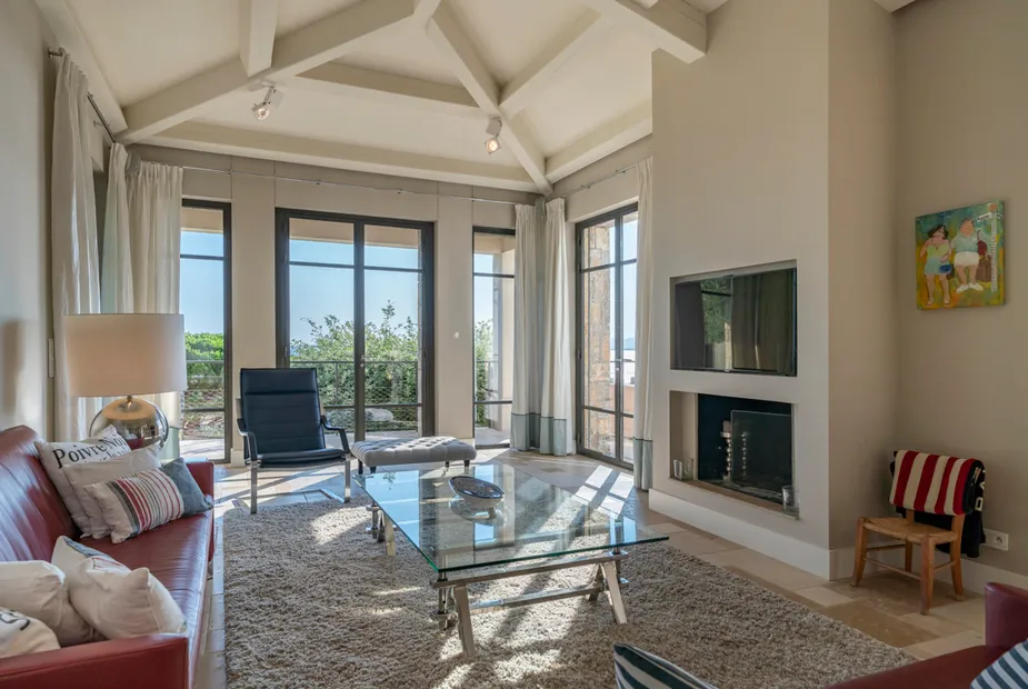 Гостиная открытой планировки с камином и видом на море
