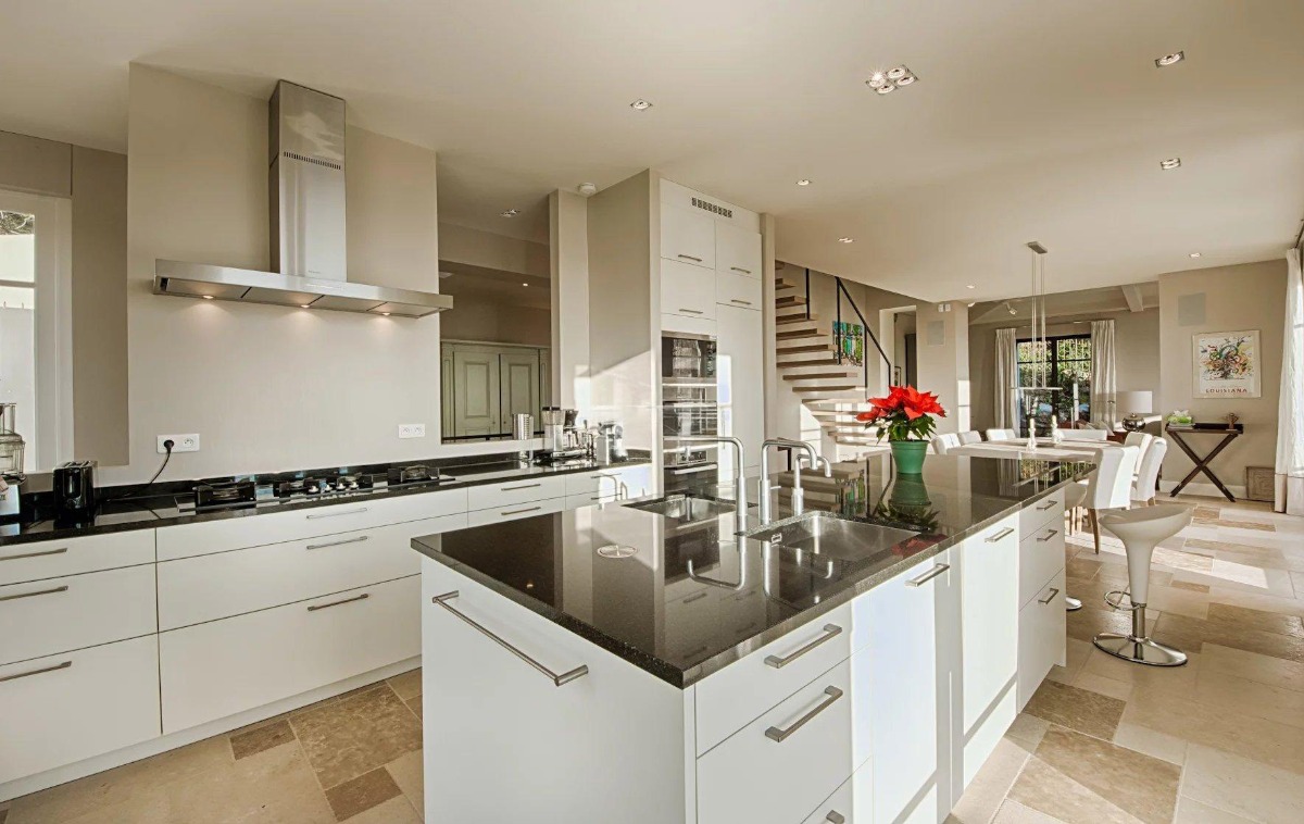 Ещё две спальни размещены в отдельном гостевом доме, расположенном в передней части участка. Он занимает два уровня и включает уютную гостиную-столовую с кухней, спальню с кроватью king-size и комнату с двухъярусной кроватью — идеальное решение для гостей или семьи с детьми.