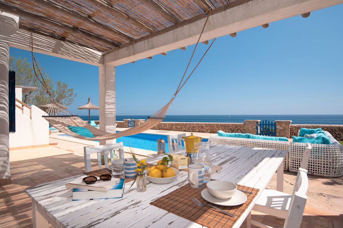 Просторная терраса у бассейна — идеальное место для летних ужинов и отдыха с видом на море.