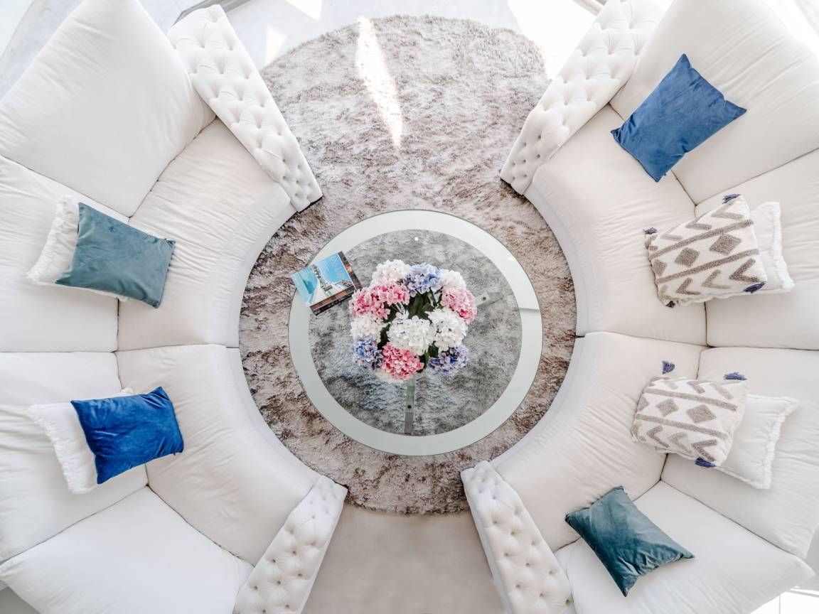- просторная гостиная с выходом к бассейну