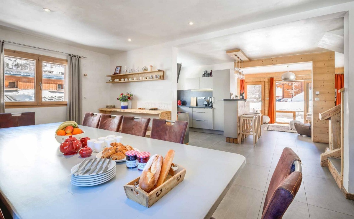Стойка для завтрака, примыкающая к элегантной кухне, дает возможность зарядиться энергией перед усердным днем катания на лыжах. По возвращении со склонов насладитесь ужином всей группой, удобно расположившись вокруг большого обеденного стола, максимально используя возможности самостоятельного и бесконтактного питания в шале. Снаружи имеется собственная терраса с живописным видом на заснеженные вершины гор.