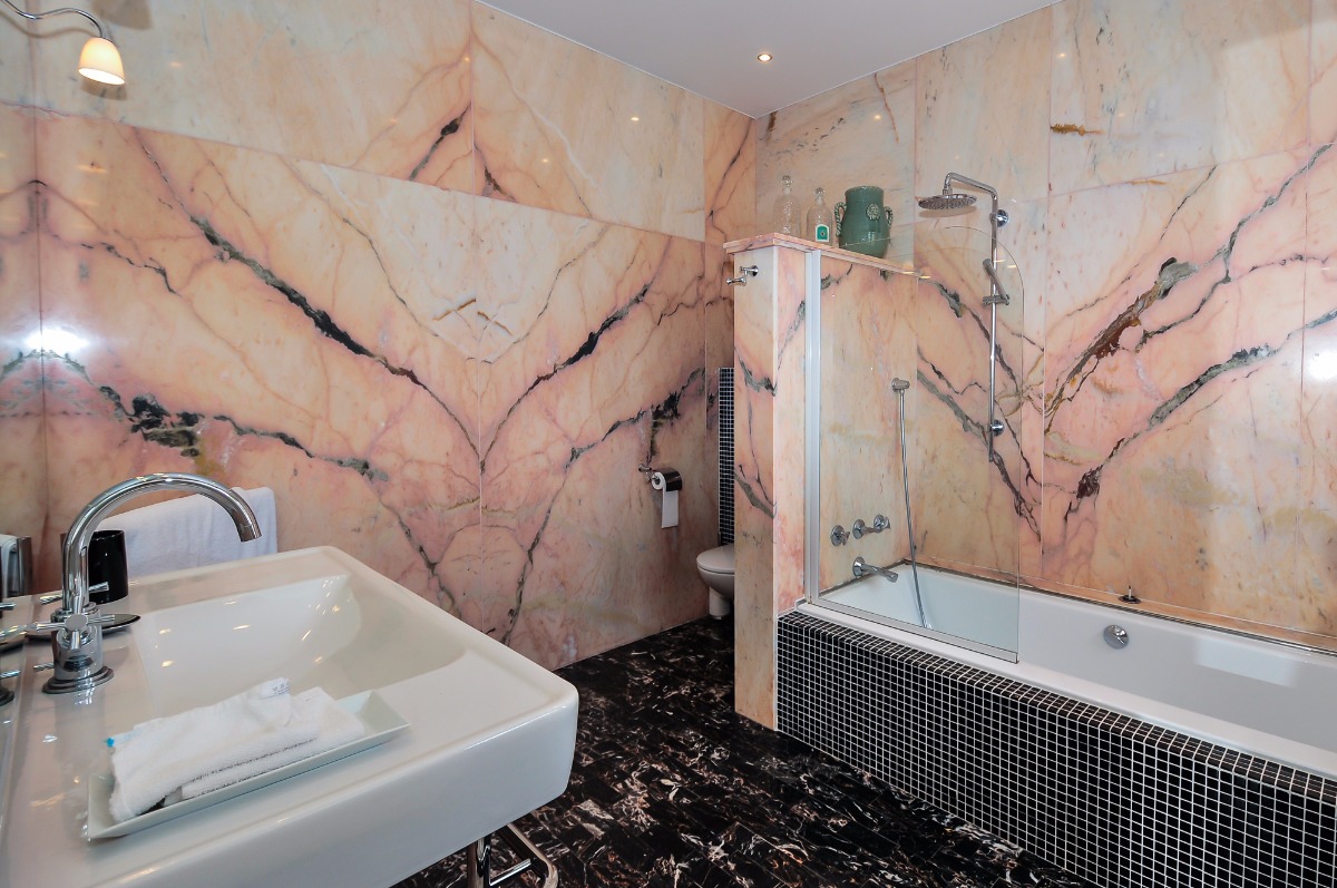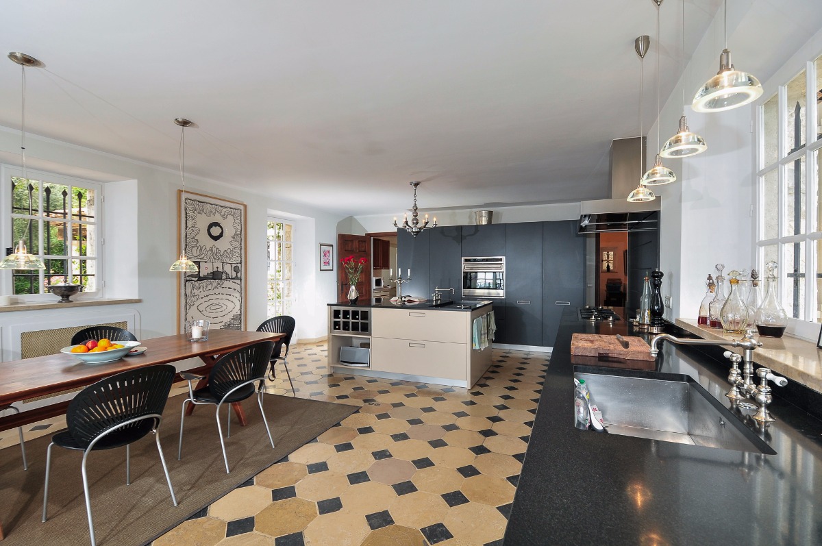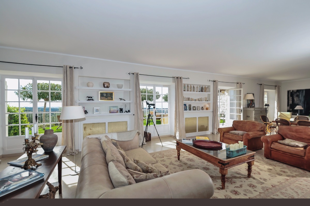 На первом этаже - гостиная-столовая с ТВ, DVD, камином, выходом на террасу в сад с видом на море, большая современная кухня с залом для завтраков и ТВ, выходом на террасу с обеденным столом и стульями, 2 гостевых туалета.