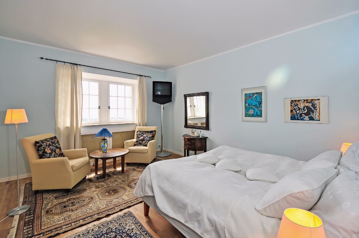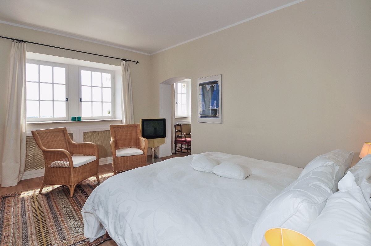 На втором этаже - все спальни с видом на море, мастер-спальня с 2-спальной кроватью, ТВ, выходом на балкон, кондиционером, ванной и туалетом, кабинетом с диваном-кроватью в башенке. 2 спальни по 2 кровати (можно сдвинуть), ТВ, каждая с собственной ванной-туалетом. Сьют с 2-спальной кроватью, ТВ, альковом с 2 кроватями для детей, ванная, туалет. Еще одна спальня с 2-спальной кроватью и креслами, отдельная ванная с душевой, туалет.