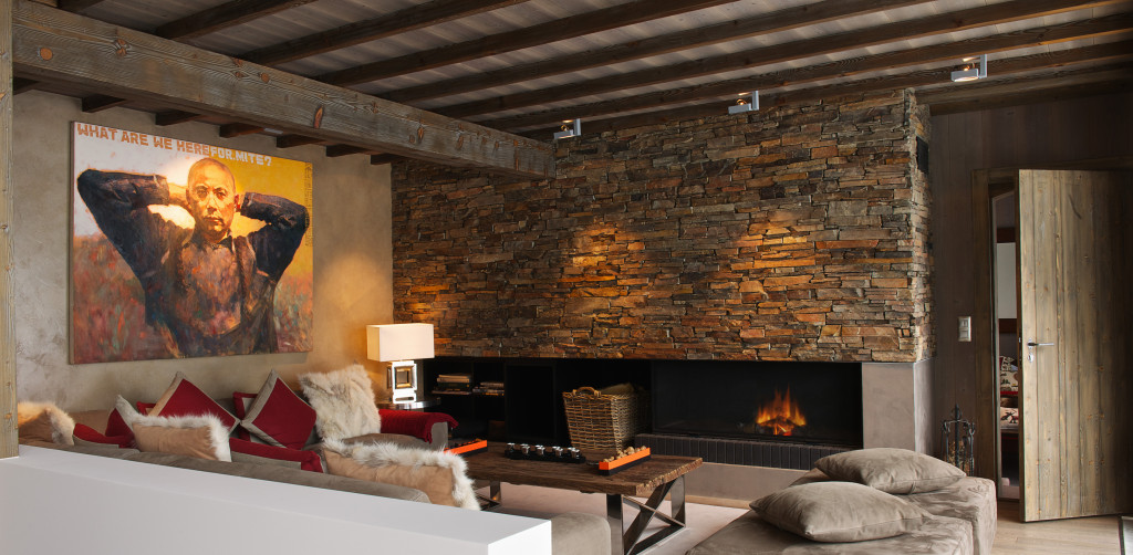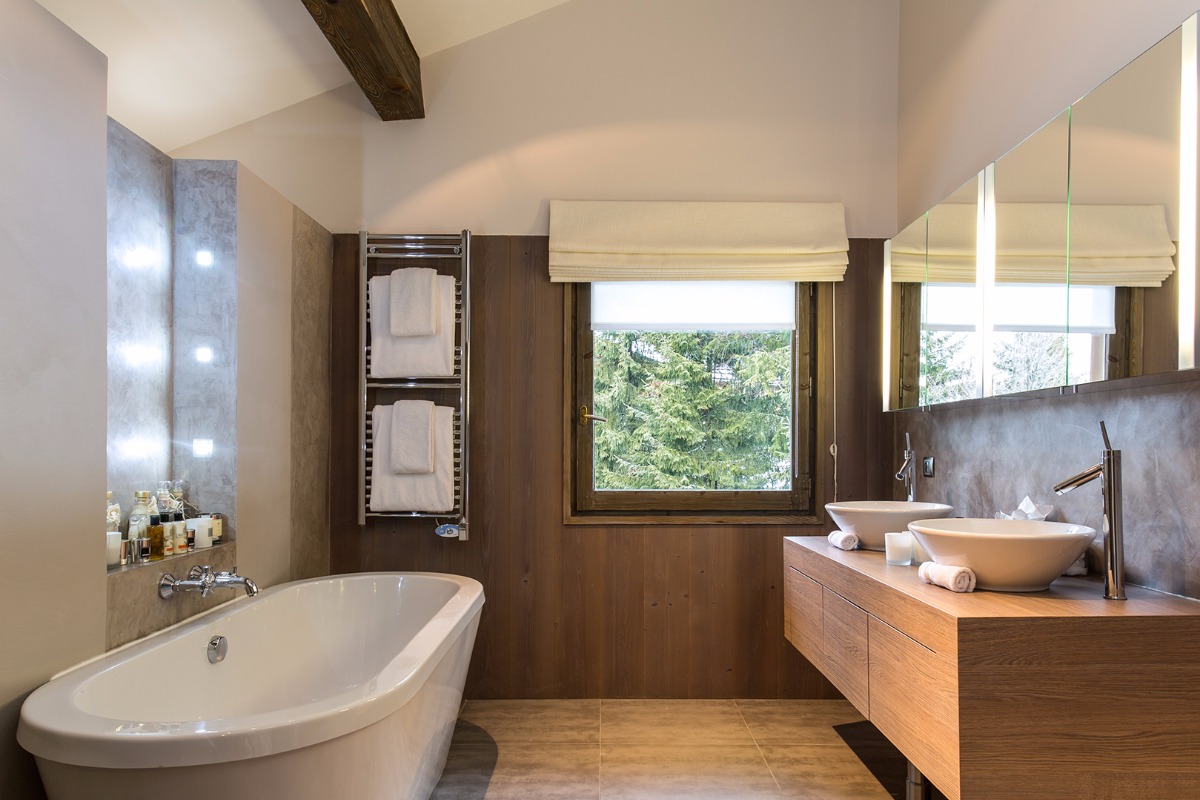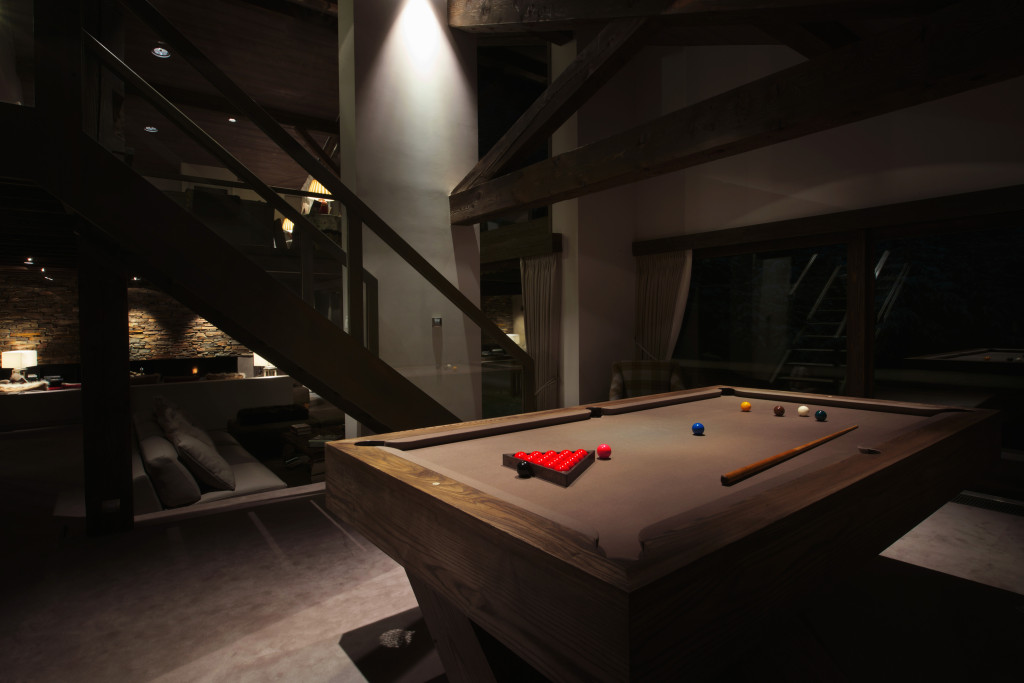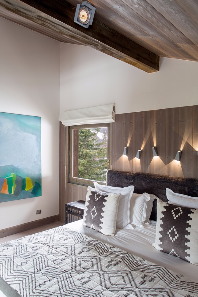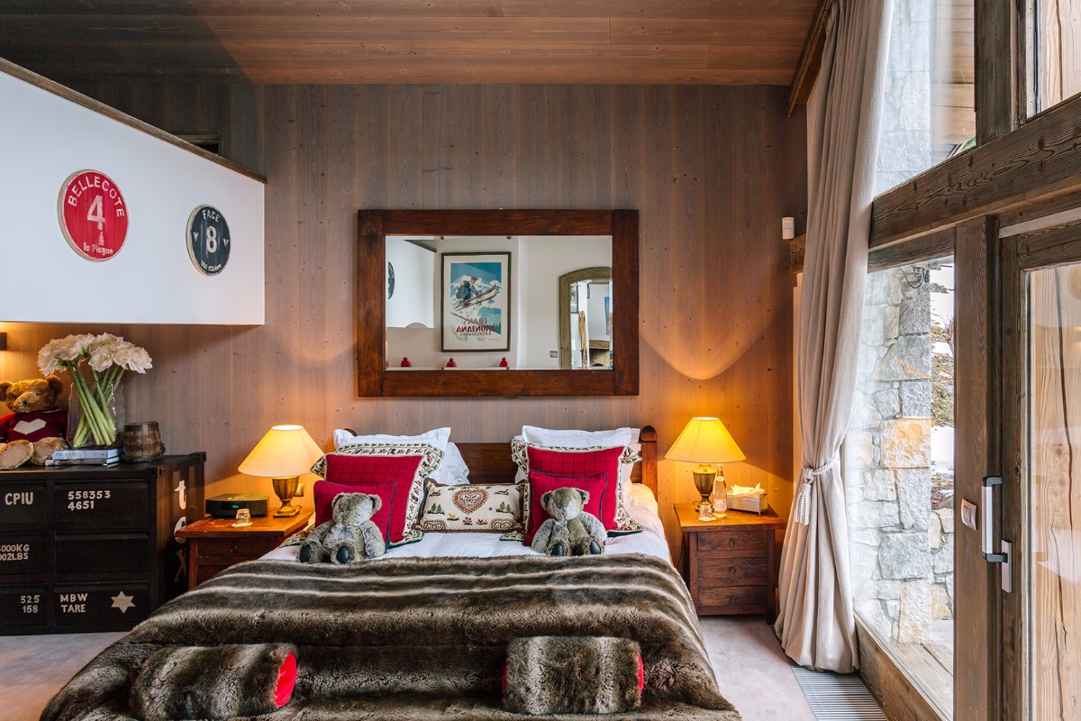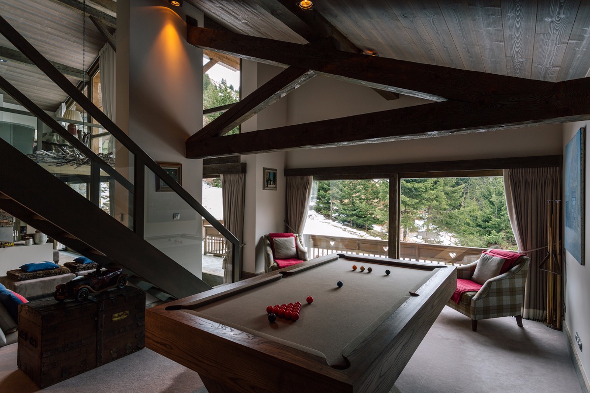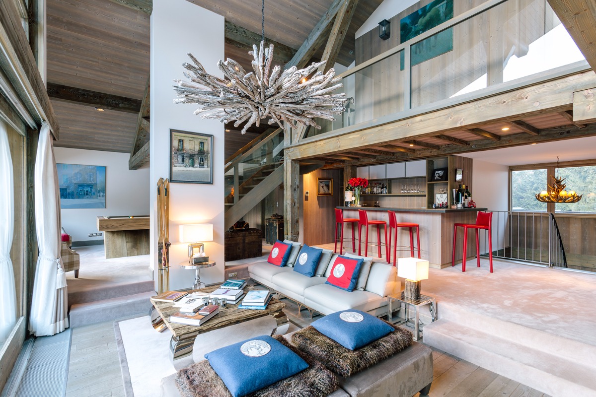 Шале располагает 7 спальнями, все имеют свою ванную комнату, свой уникальный дизайн и цветовую гамму. Из огромных панорамных окон открываются великолепные виды на горы и пик Мон-Валлон, гостиная с камином открытого типа, в едином пространстве с зоной столовой, собственным баром и бильярдным столом. На нижнем уровне есть домашний кинозал, рабочий офис