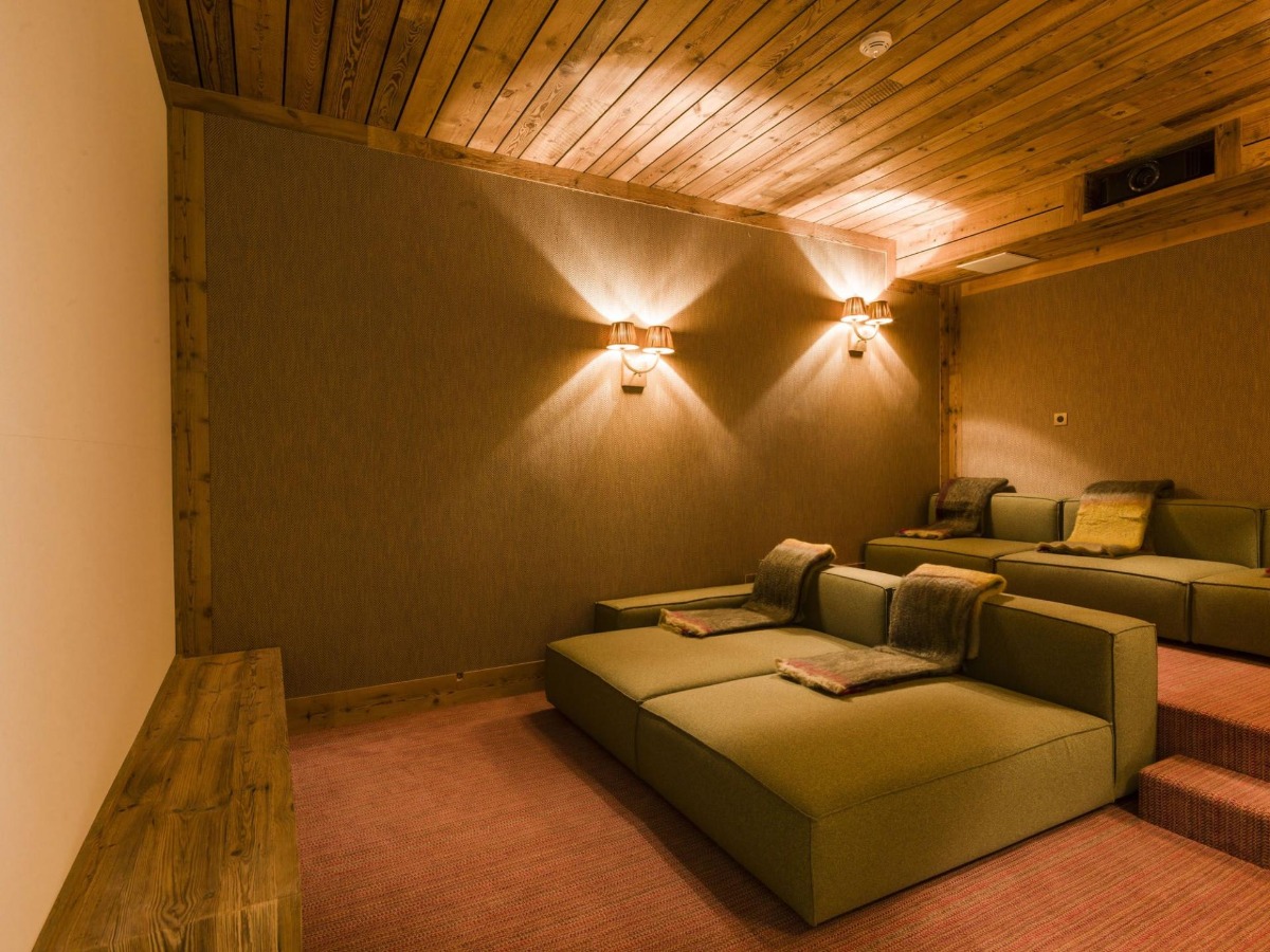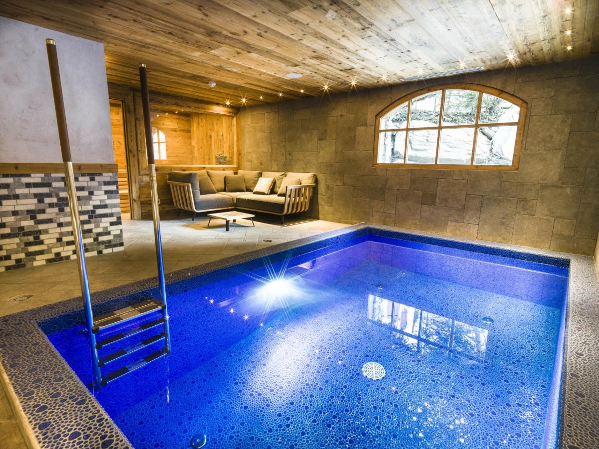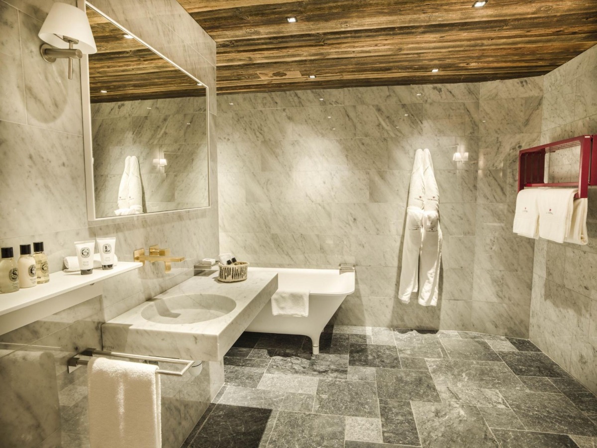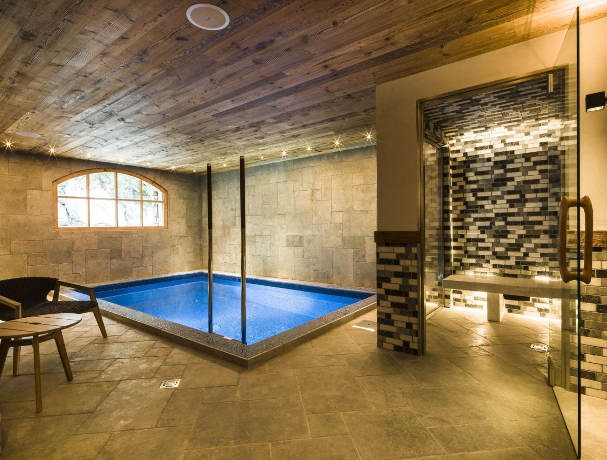 На первом этаже шале находится спальня с ванной комнатой, большой ванной и двойной раковиной. Здесь же вы найдете оздоровительный центр в шале, крытый бассейн с противотоком, паровую баню, сауну и массажный кабинет. Лыжная комната также находится на этом уровне.