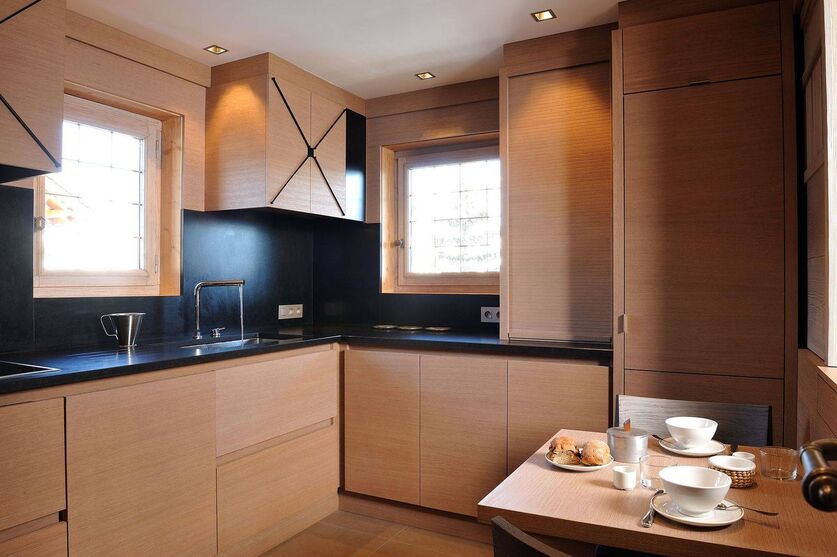 Апартаменты расположены в традиционном шале с полностью деревянным фасадом, все балконы и фасады облицованы этим благородным материалом. Архитектура интерьера абсолютно современная, но не в ущерб гостеприимному горному стилю. Эти апартаменты - идеальное сочетание изысканных тонов и благородных материалов.