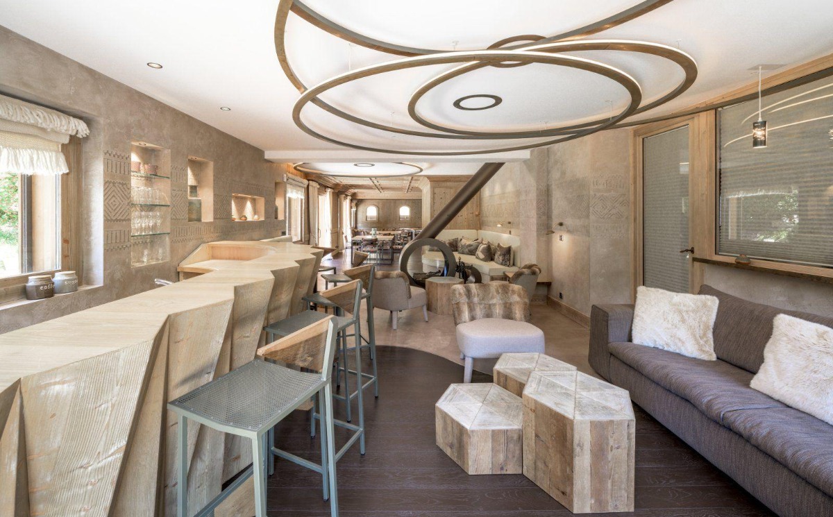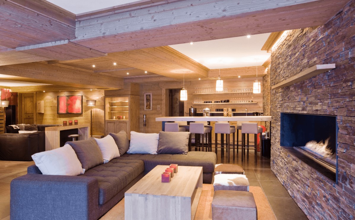 На первом этаже шале доминирует гостиная и обеденная зона открытой планировки, а главной особенностью гостиной является яркий камин в центре. Несмотря на ультрасовременность, деревянная мебель и мягкие детали создают ощущение домашнего уюта. Благодаря широкому выбору диванов, барных стульев и деревянных табуреток достаточно места, чтобы все могли находиться в одной комнате, расслабляясь и обсуждая дела дня.