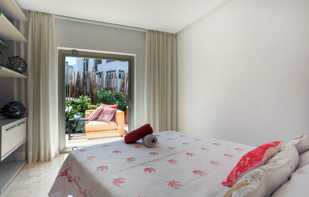Обе спальни имеют выход на просторную террасу с видом на бассейн и сад. Здесь обустроена зона отдыха с диванами и баром — идеальное место для вечернего отдыха или спокойного начала дня.