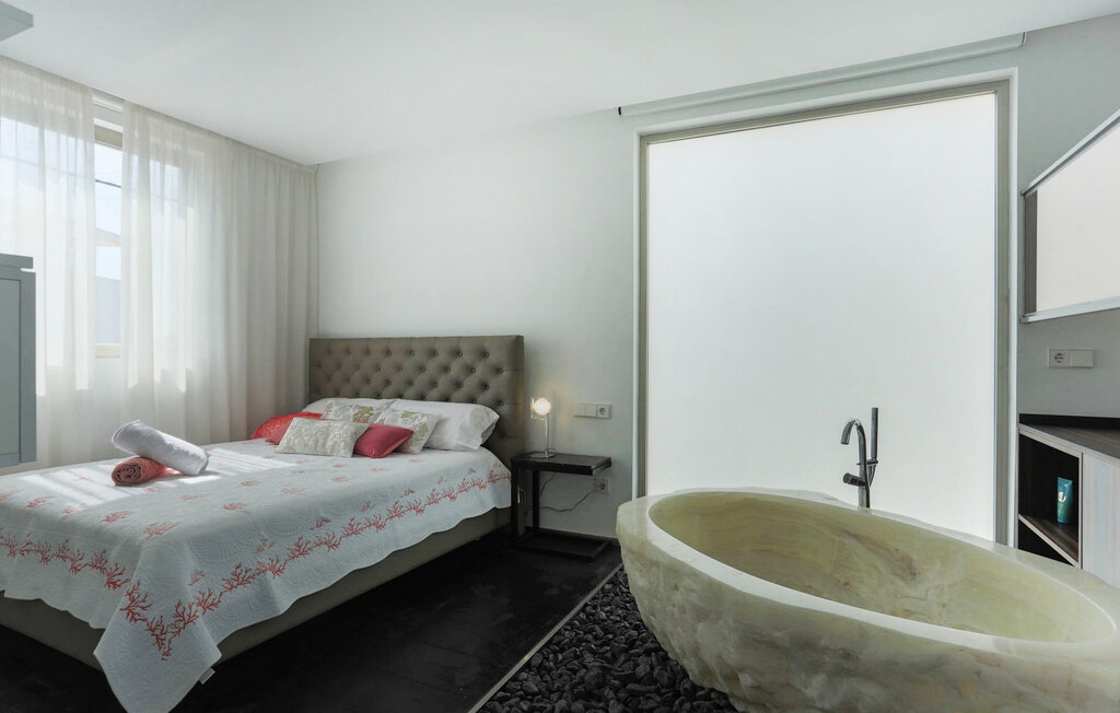главная спальня с эффектной мраморной ванной, расположенной прямо в комнате