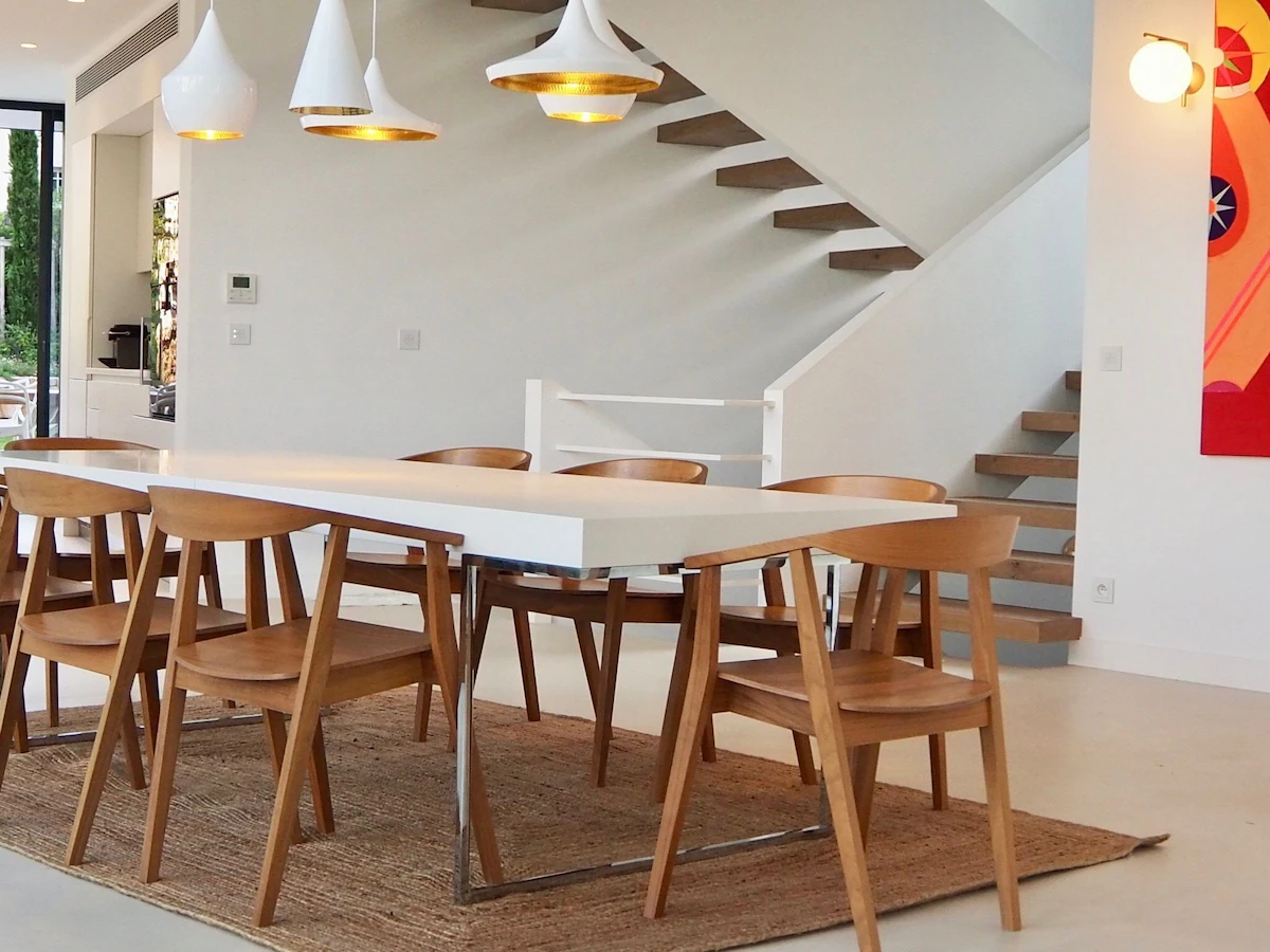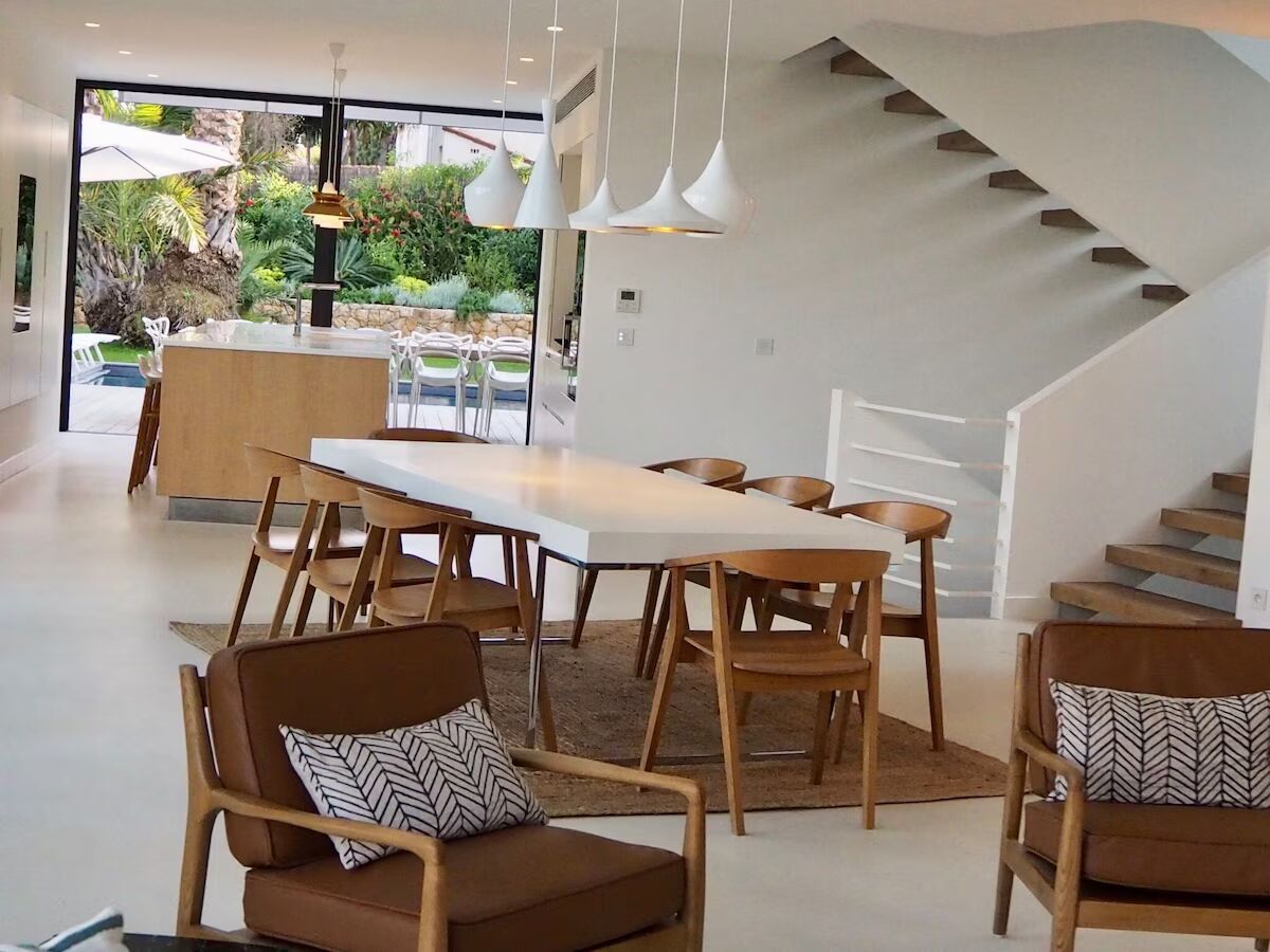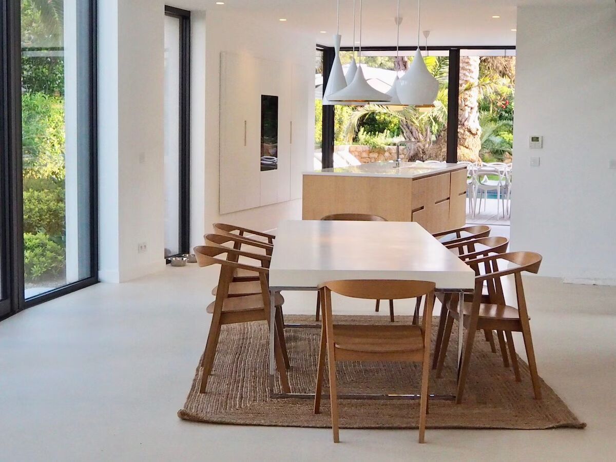 На первом этаже расположена открытая жилая зона, включающая полностью оборудованную современную кухню-столовую открытой планировки высокого класса (Gaggenau, Miele, Liebherr), вмещающую 8-10 гостей.