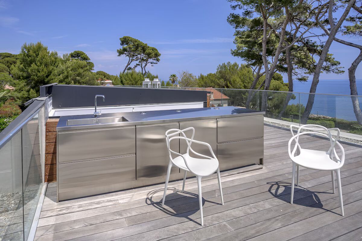 С террасы на крыше открывается потрясающий вид на море, простирающийся от Италии до пляжа Ла-Гаруп! Здесь же расположена летняя кухня с раковиной, посудомоечной машиной и холодильником, а также столом и стульями, идеально подходящими для утреннего кофе или аперитива на закате, и зона отдыха с диванами и шезлонгами.
