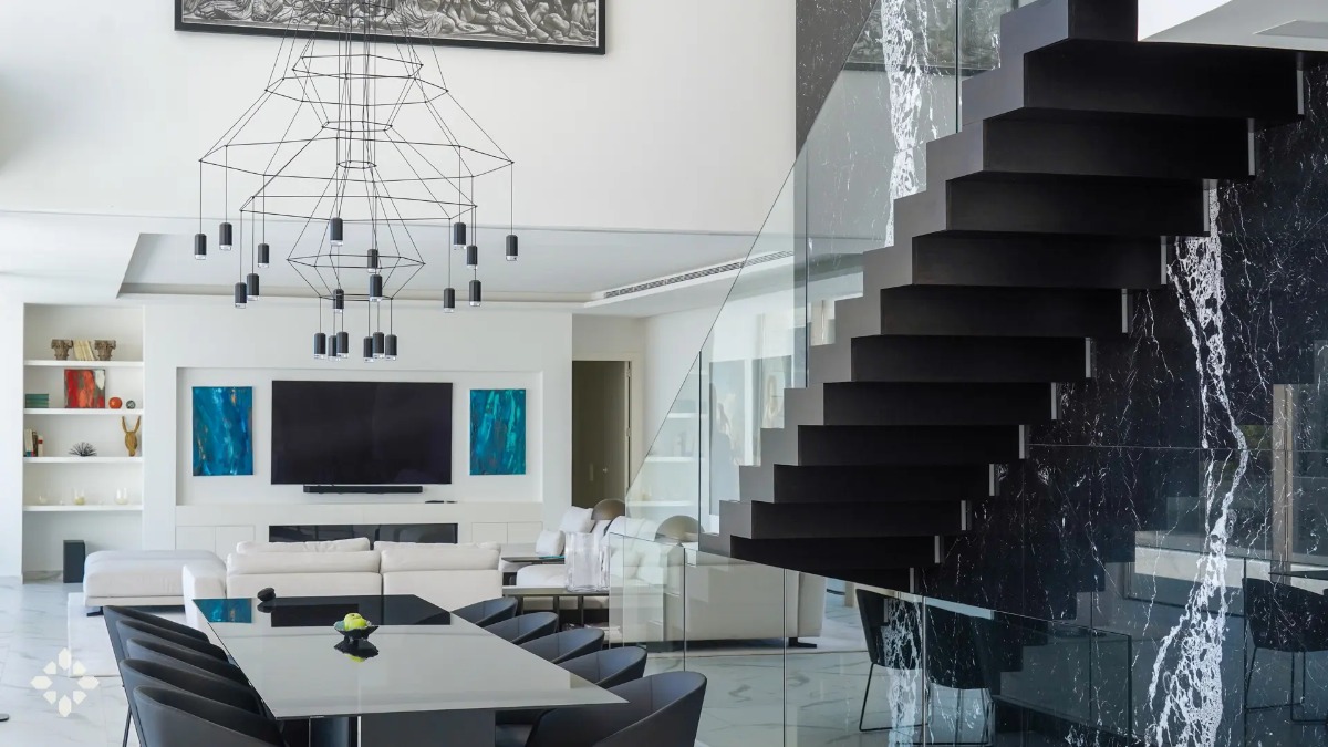 На среднем уровне находится просторная гостиная и столовая открытой планировки, соединённые с современной кухней.