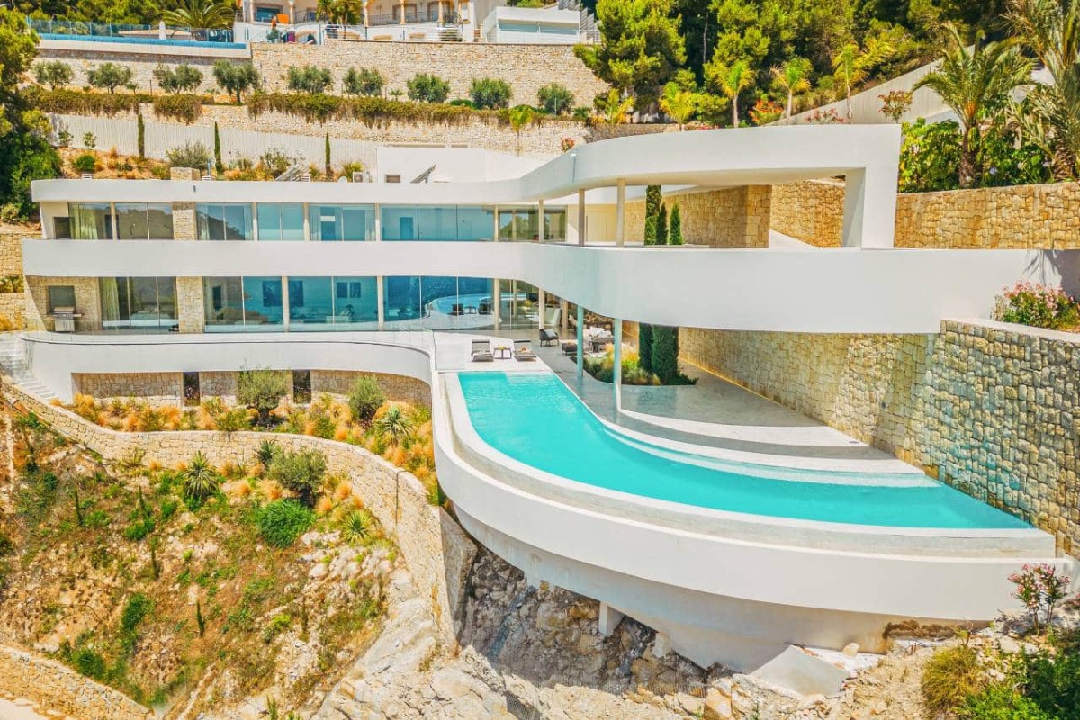 Вилла окружена просторными террасами необычной архитектурной формы, откуда открываются впечатляющие виды на Средиземное море.