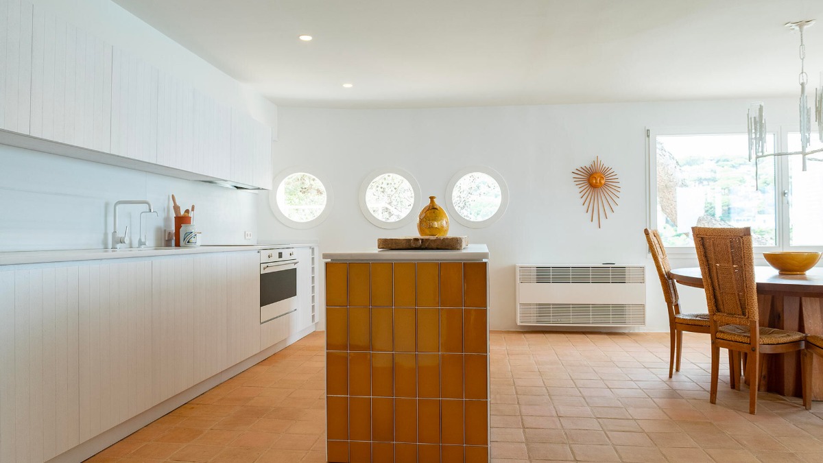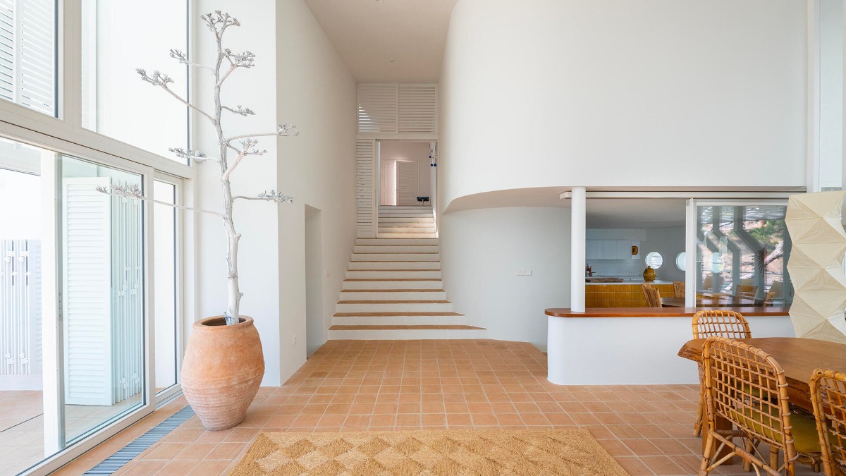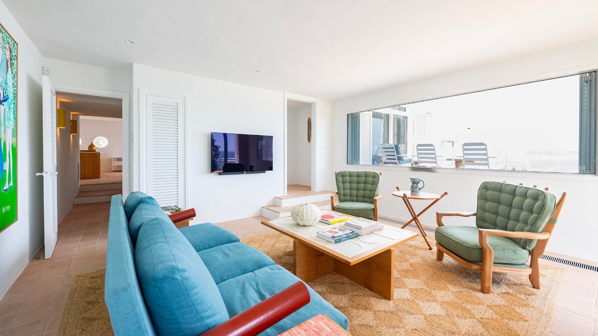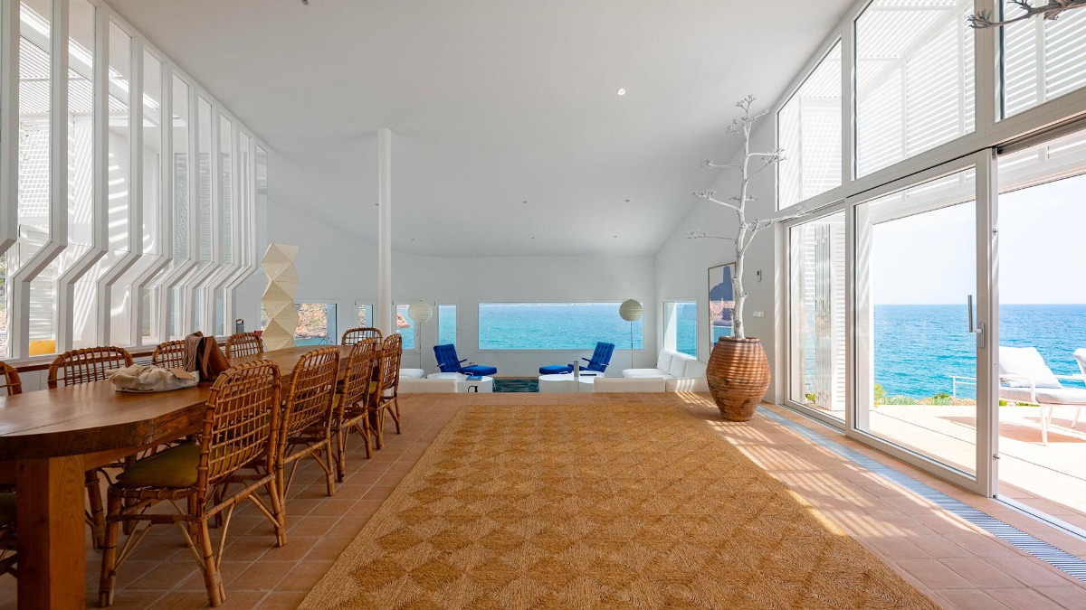 Гостиная, столовая и полностью оборудованная кухня образуют единое пространство, ориентированное на панорамные виды и естественный свет. Интерьер сочетает комфорт и функциональность, создавая спокойную атмосферу для отдыха у моря.