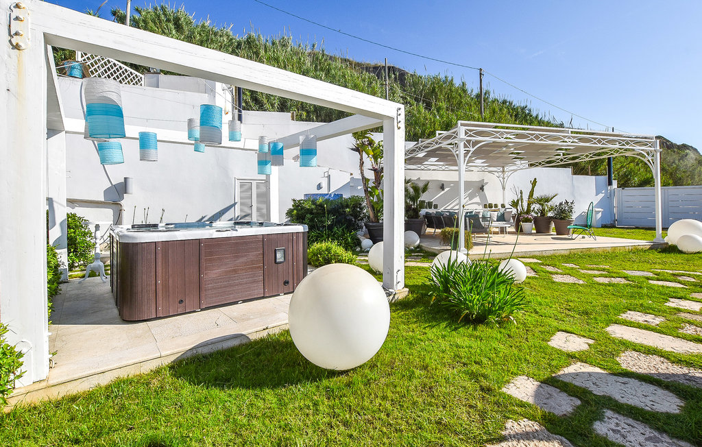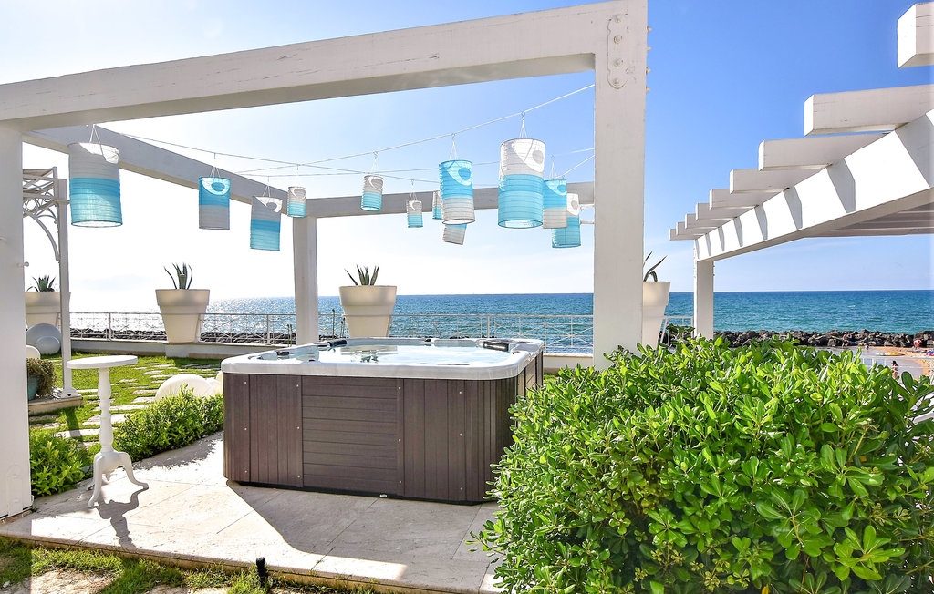 участок около 500 м², частный огороженный сад, открытые и крытые террасы, зона отдыха с шезлонгами, джакузи на 6 человек, барбекю. Сад ориентирован в сторону моря, что делает его основным пространством для отдыха.