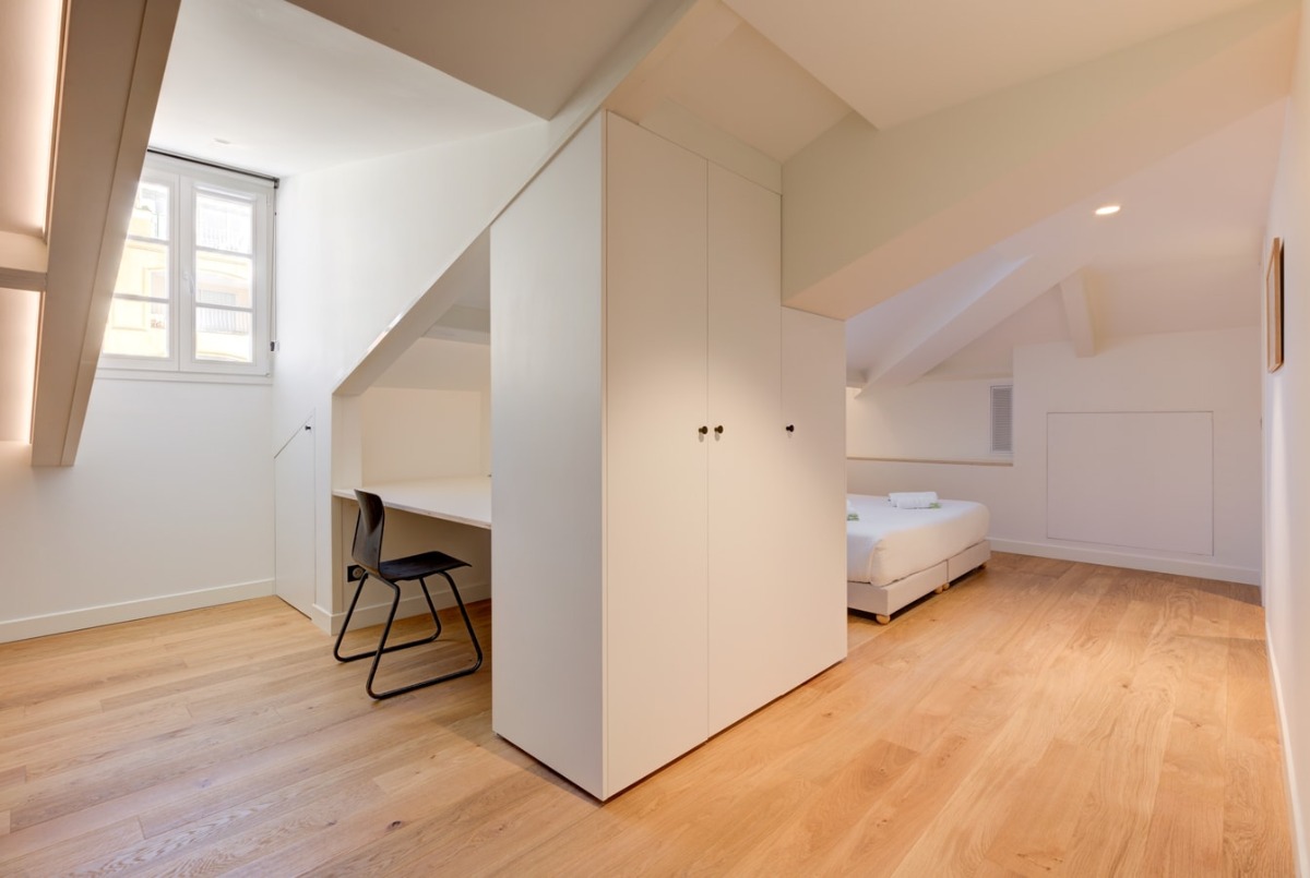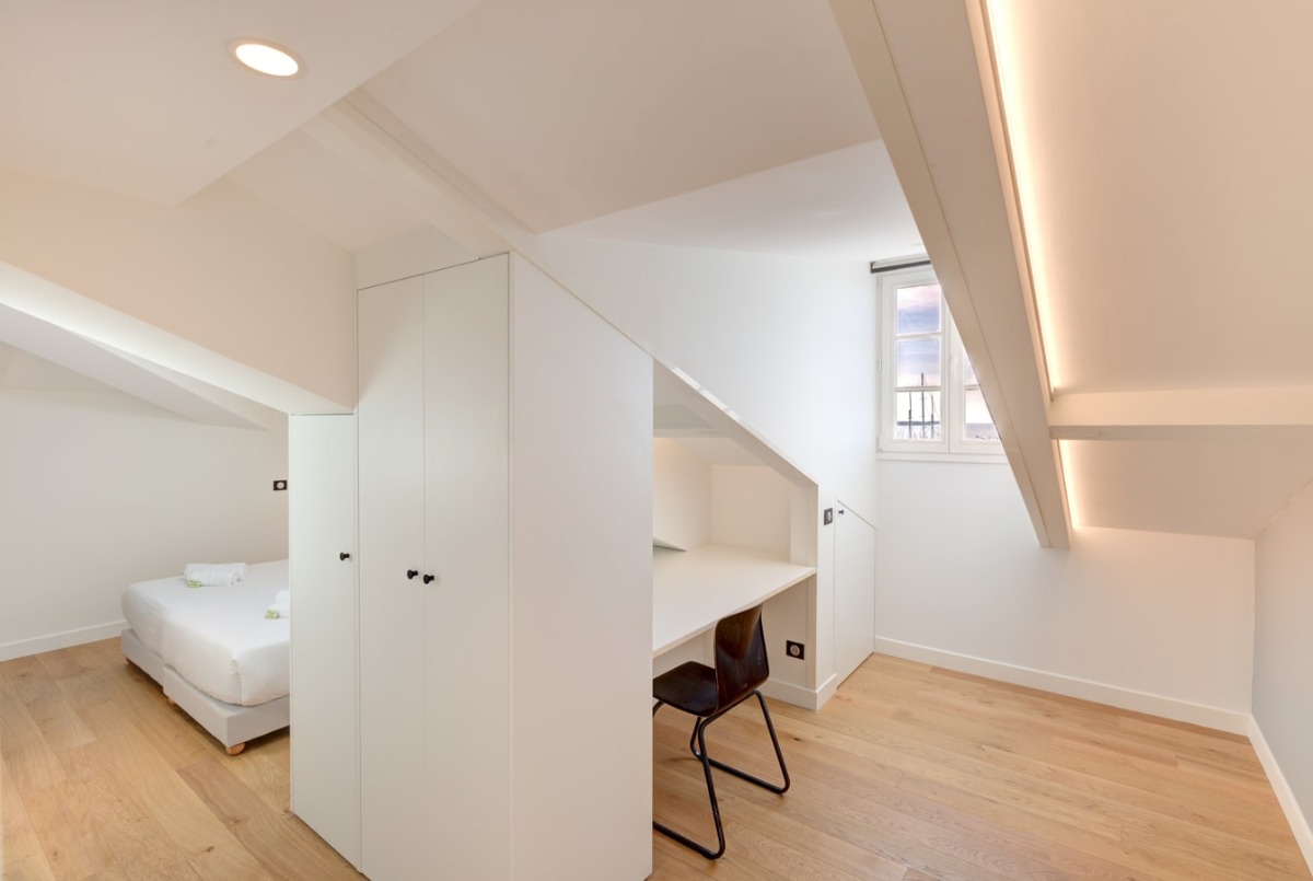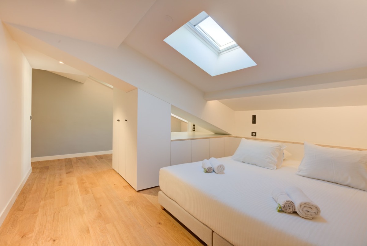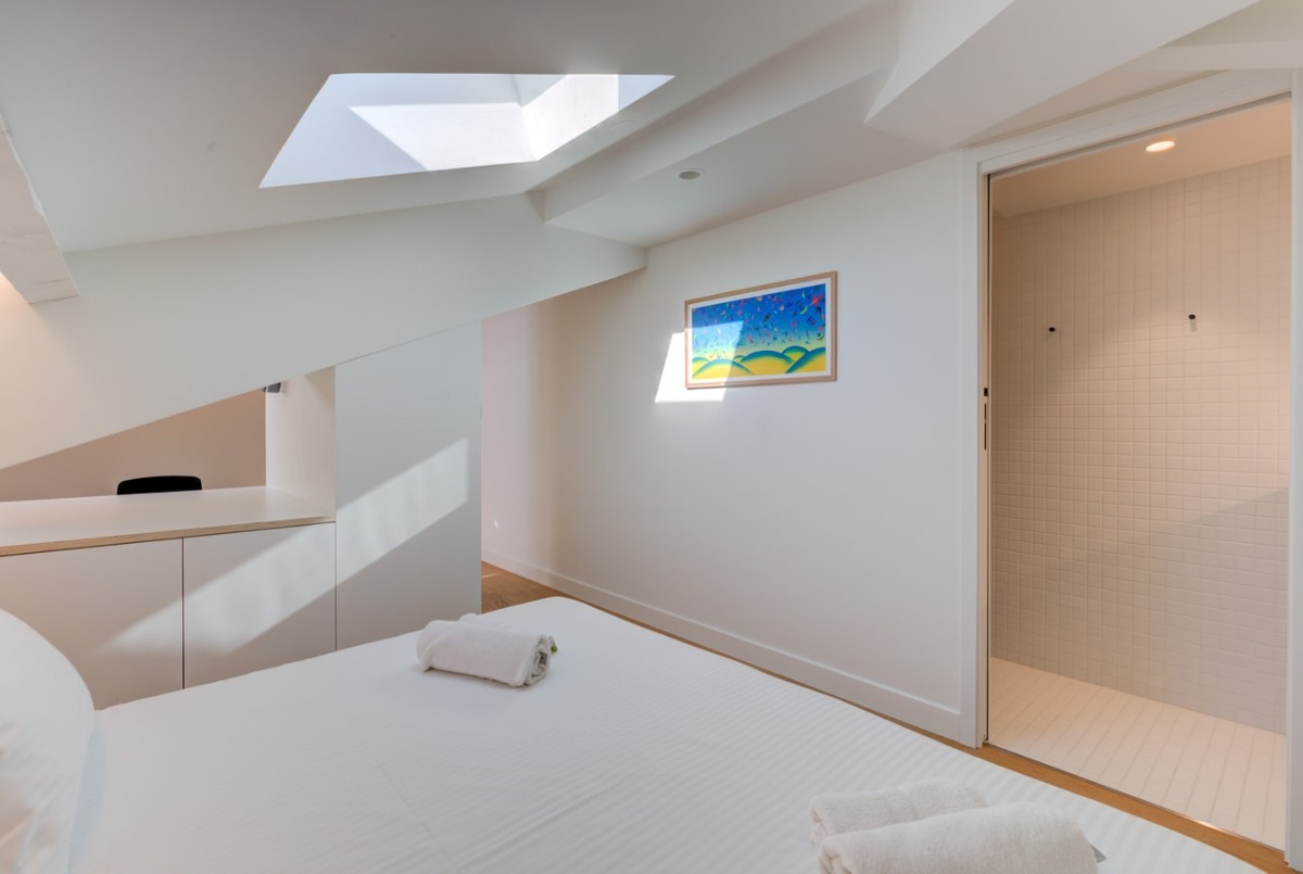 Апартамент отличается высокими потолками, большими окнами и продуманной планировкой. Гостиная выходит на балкон с видом на порт — комфортное пространство для отдыха или коротких пауз между деловыми встречами.