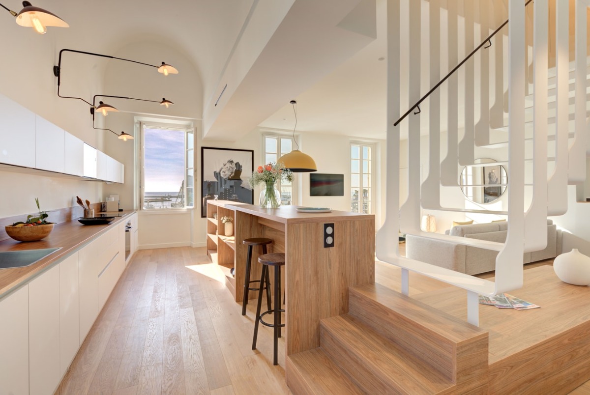 Открытая кухня полностью оборудована и органично интегрирована в жилую зону.